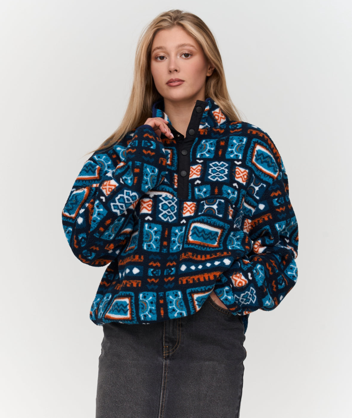 We are getting ready for cosy season with our new Aztec fleece. A longline fleece that features a half popper fasten front along with long sleeves. The quirky Aztec print makes this the perfect off duty style.