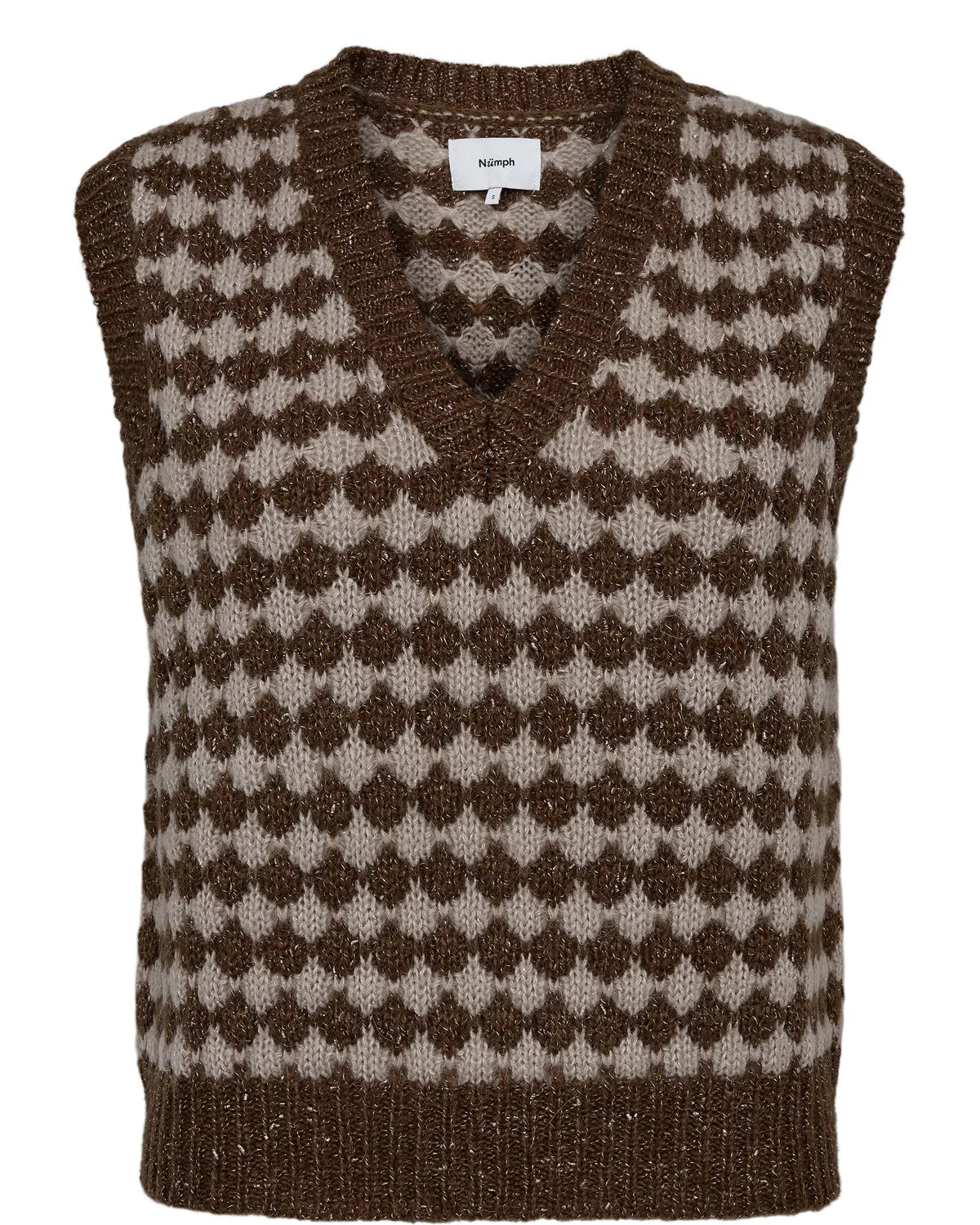 Elevate your wardrobe with the Numph Bila Vest. Featuring a bold toffee and cream checkered pattern, this vest adds a touch of timeless style to any outfit. Perfect for layering, it offers a chic and versatile look that transitions effortlessly from casual days to stylish evenings. Make a statement with this must-have piece that combines classic design with modern flair.