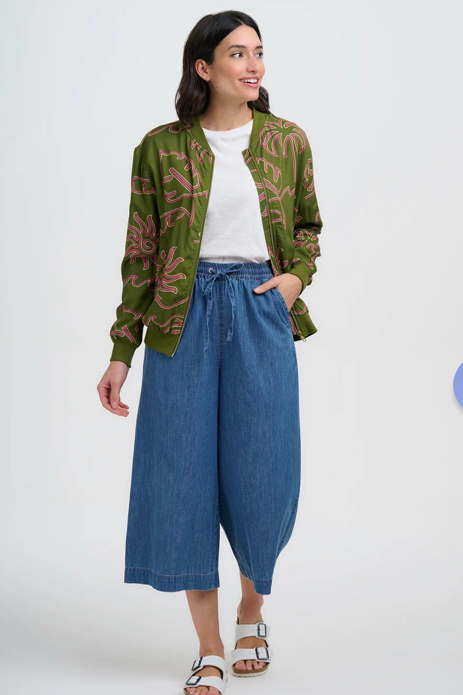 Say hello to your new favourite jacket - the Bobbi Bomber Jacket. A fresh style for the season, Bobbi combines a relaxed, easy fit with a lightweight feel, making it perfect for throwing over tees, knits, or dresses. Bright pink and yellow tropical line drawings of suns, waves, and palms flow across an earthy green background – giving it that playful, tropical edge.