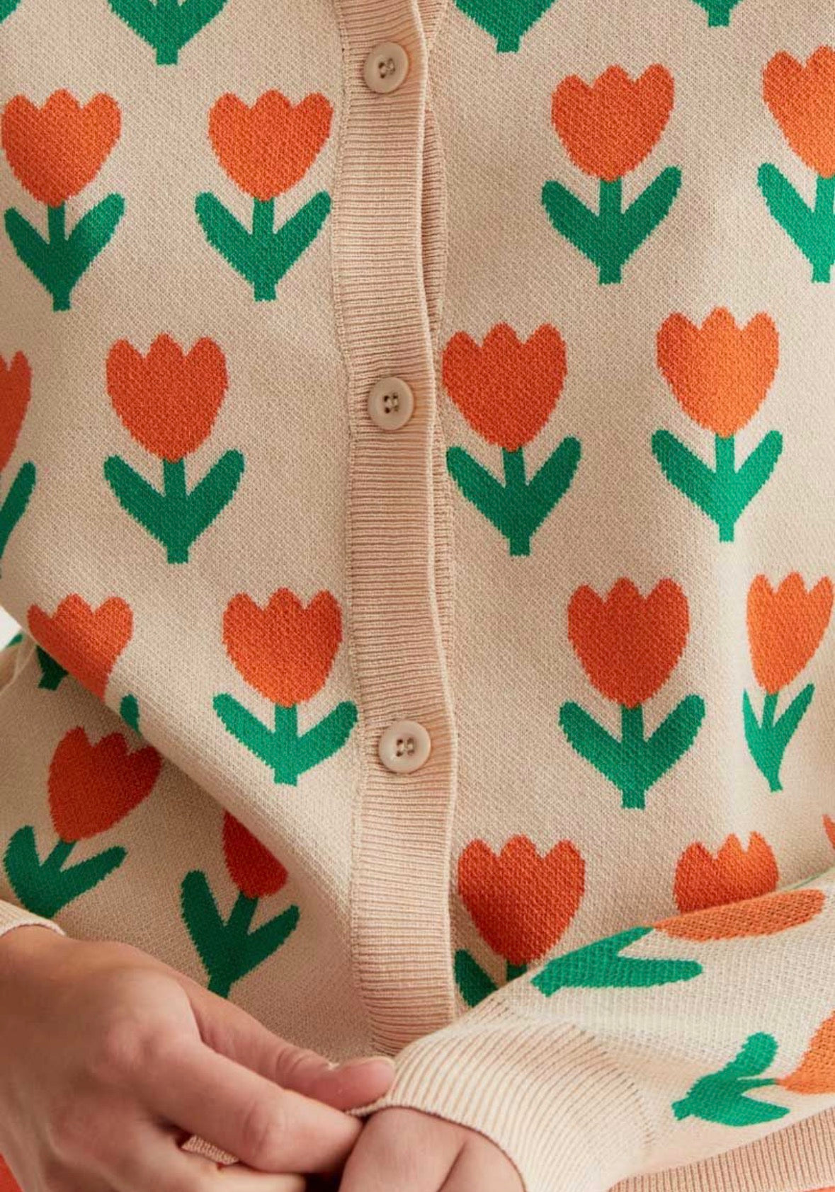 We are getting in the Spring mood with our Compania Fantastica Celia Tulip cardigan. An adorable cream cardigan with long sleeves, round neckline and buttoned down front. All finished off with a striking tulip repeated print. Easy to team with your jeans or our Selby trousers.