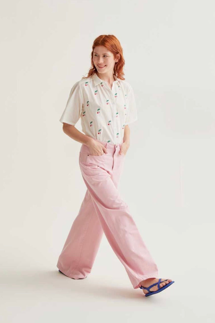 A sweet shirt from Compania Fantastica, our new Cherry shirt is perfect for Spring. A 100% cotton shirt that features a plap collar with short sleeves that have a slight puff to the shoulder. On a crisp white base with embroidered cherries to the front.