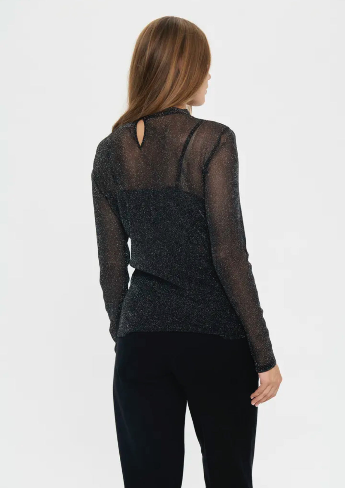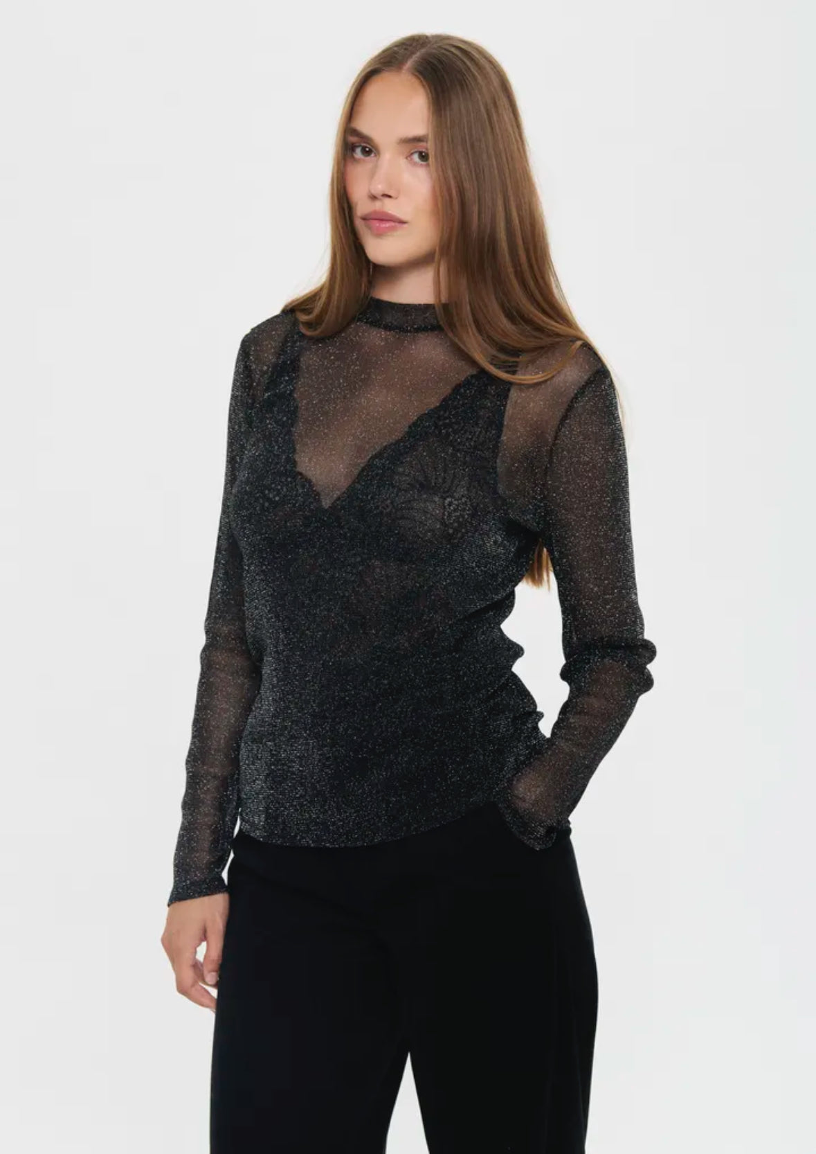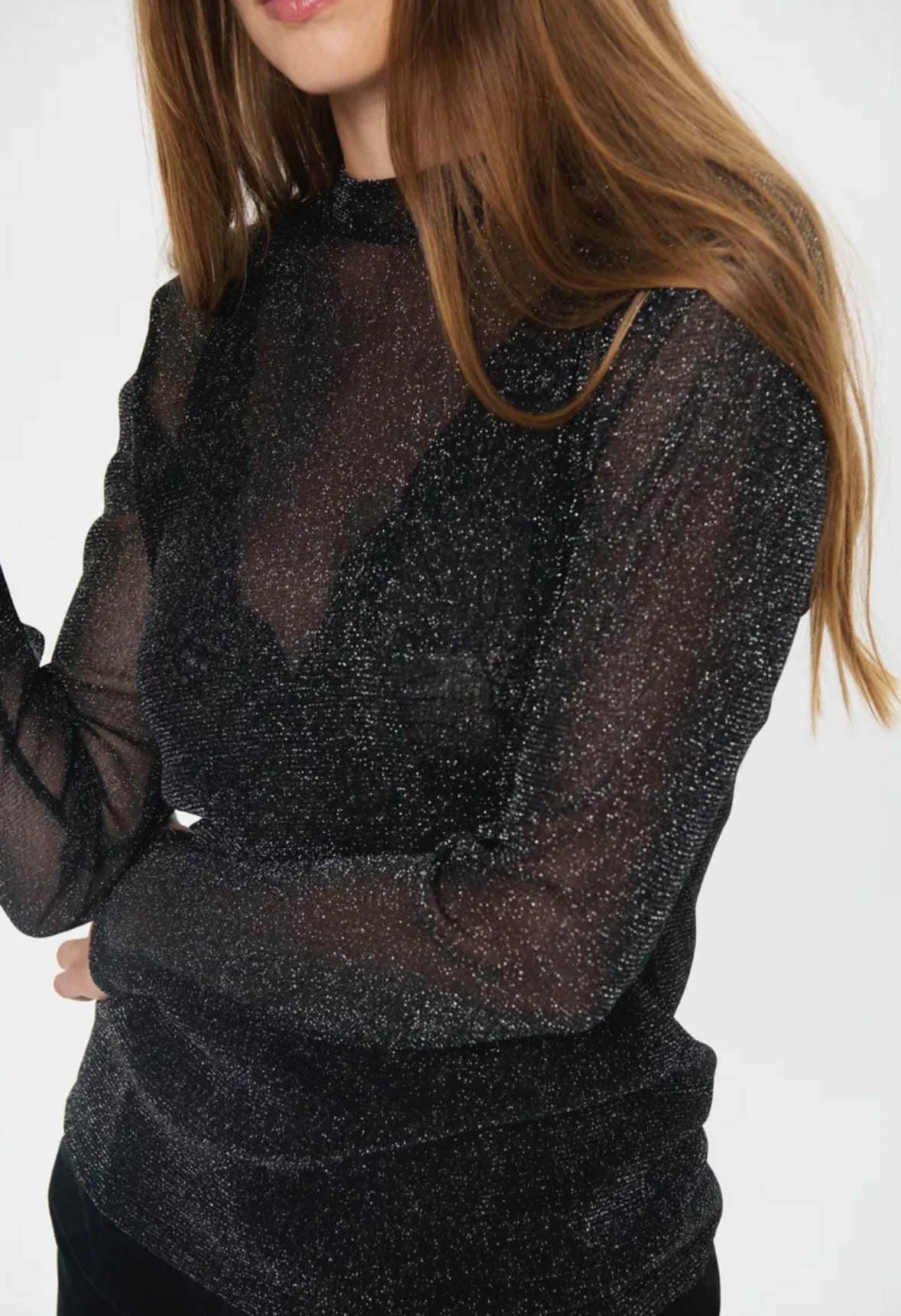 Turn up the glamour with the Saint Tropez Delila Blouse — a sleek, slim-fit piece with a high neck and subtle glitter accents. Sheer fabric adds a bold, elegant edge perfect for nights out or elevated layering. A modern must-have for making a statement.