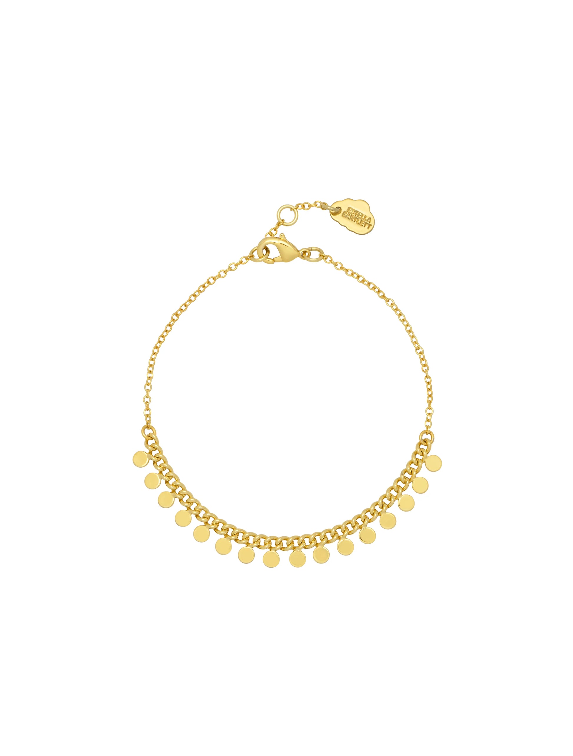 Tiny discs are suspended from a wide set chain in this beautiful gold plated bracelet. The intricacy of each disc builds up to a sophisticated and elegant bracelet, the perfect stand alone piece to elevate the perfect evening outfit.
