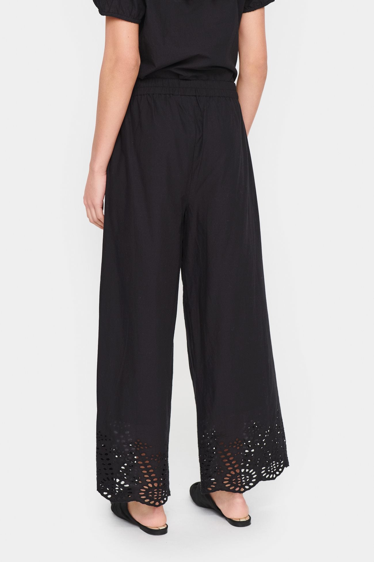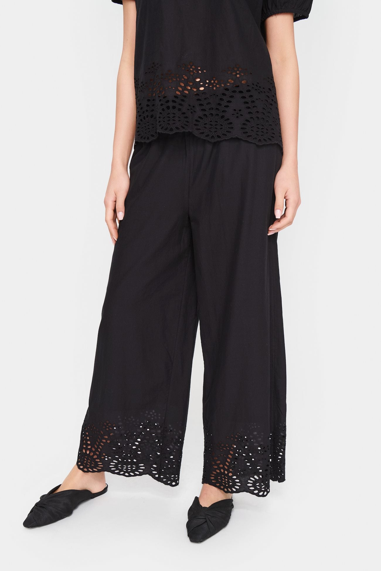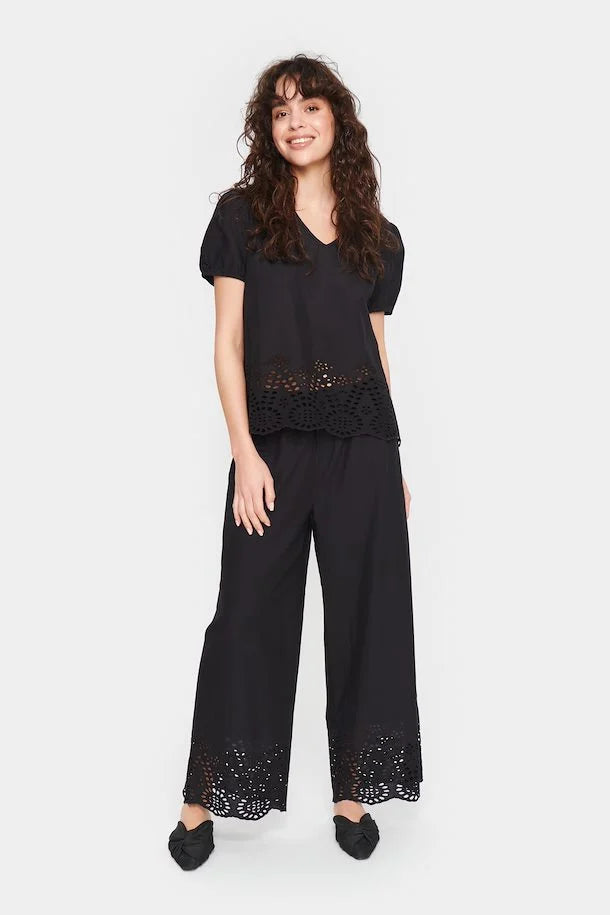 The Saint Tropez Eamaja Pants in Black are more than just another black pair of trousers. With a loose fitting leg and a pretty broidery pattern at the hem, these trousers will look great in the office or to wear out for the evening. Pair with the matching top for a go to co-ord look.