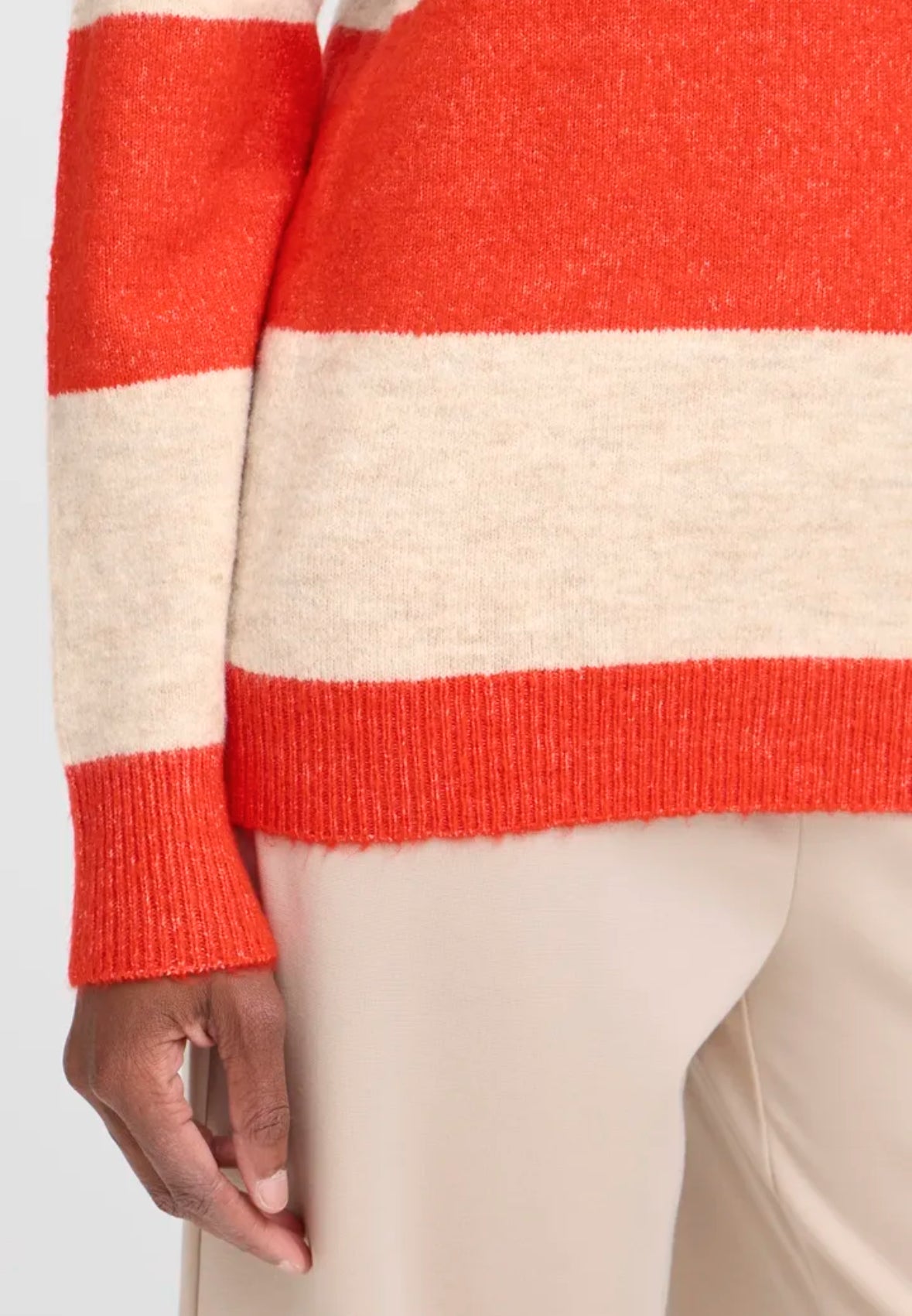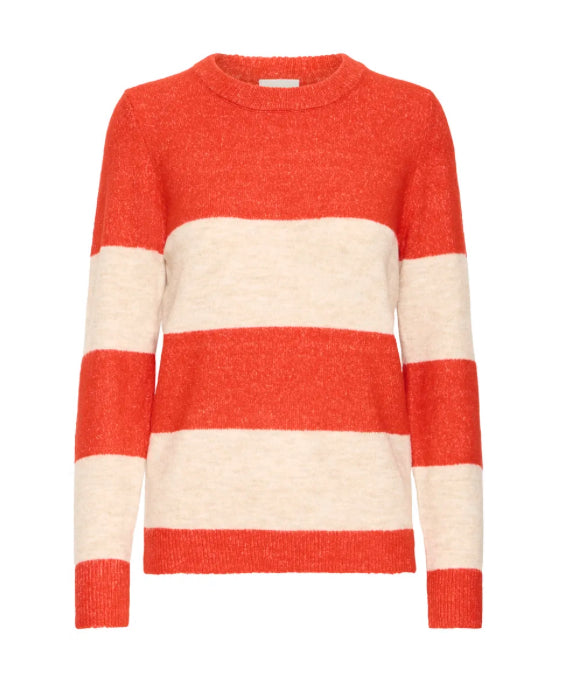 Elevate your fashion game with the Ichi Edeen jumper. Featuring a fiery red wide stripe design, this jumper exudes effortless style and comfort. Perfect for any occasion, this knit will keep you looking trendy and feeling cosy.