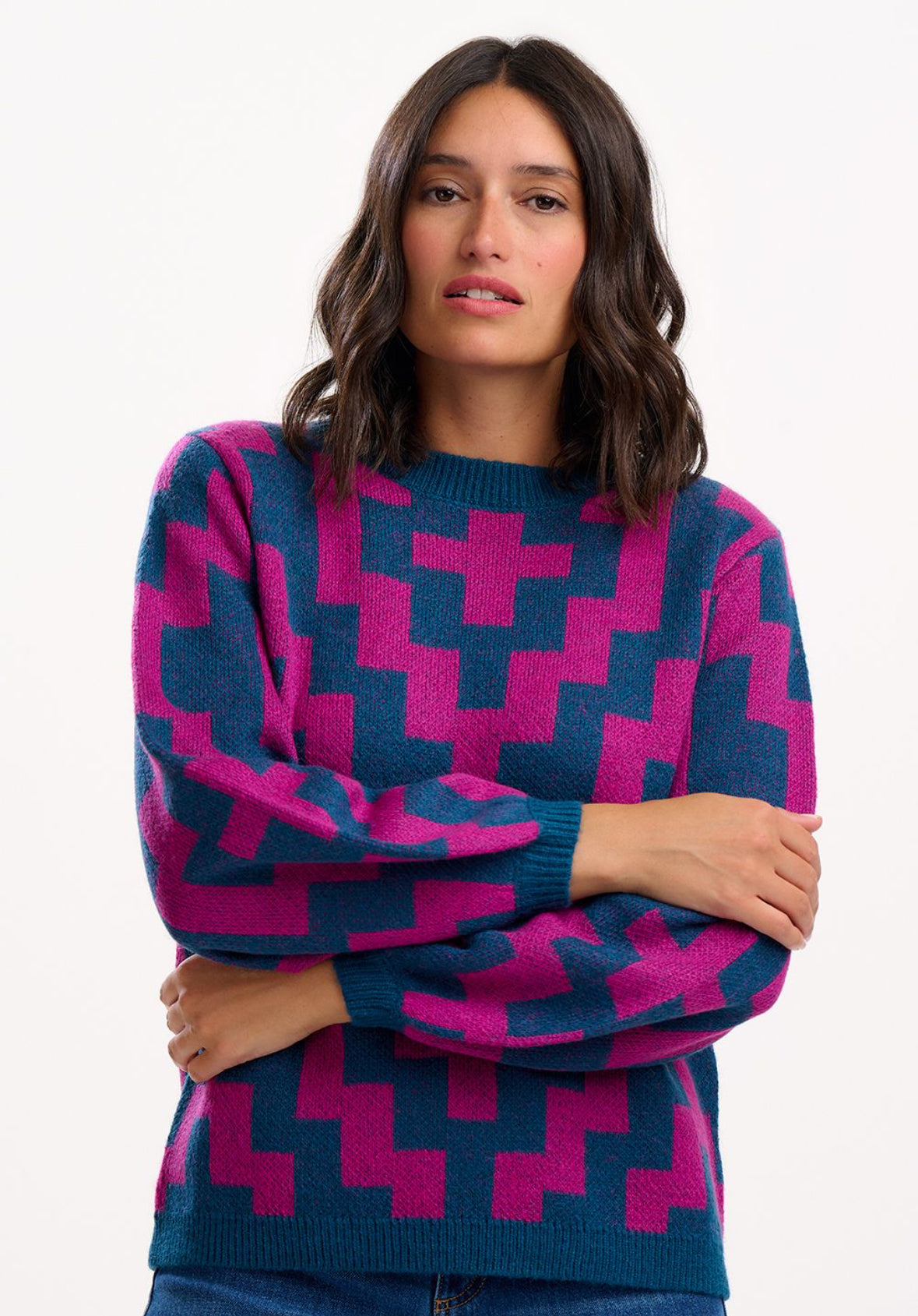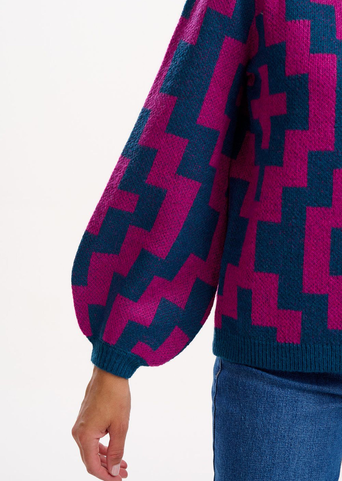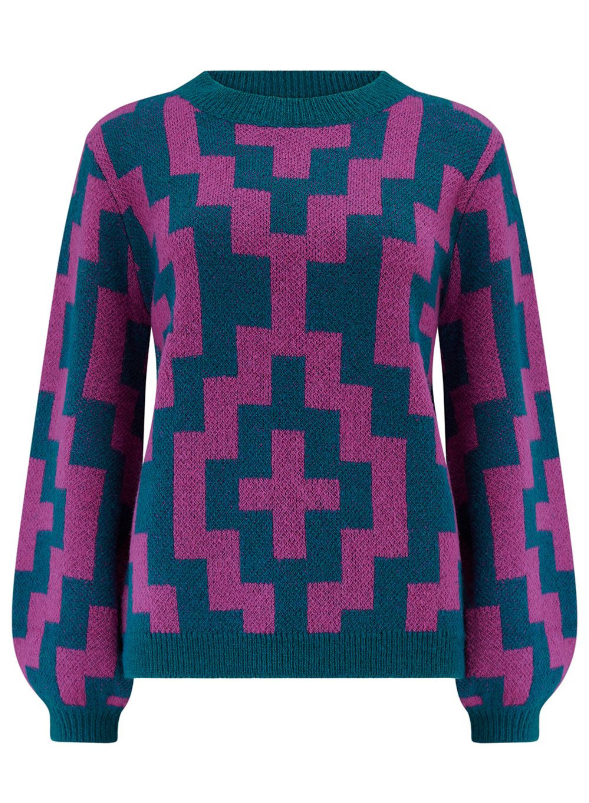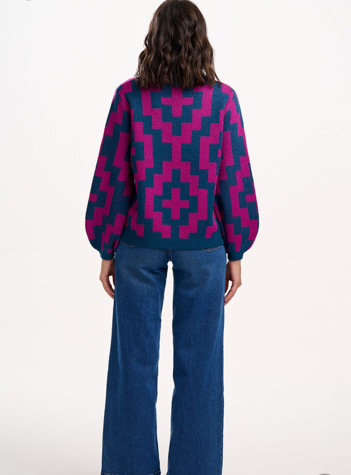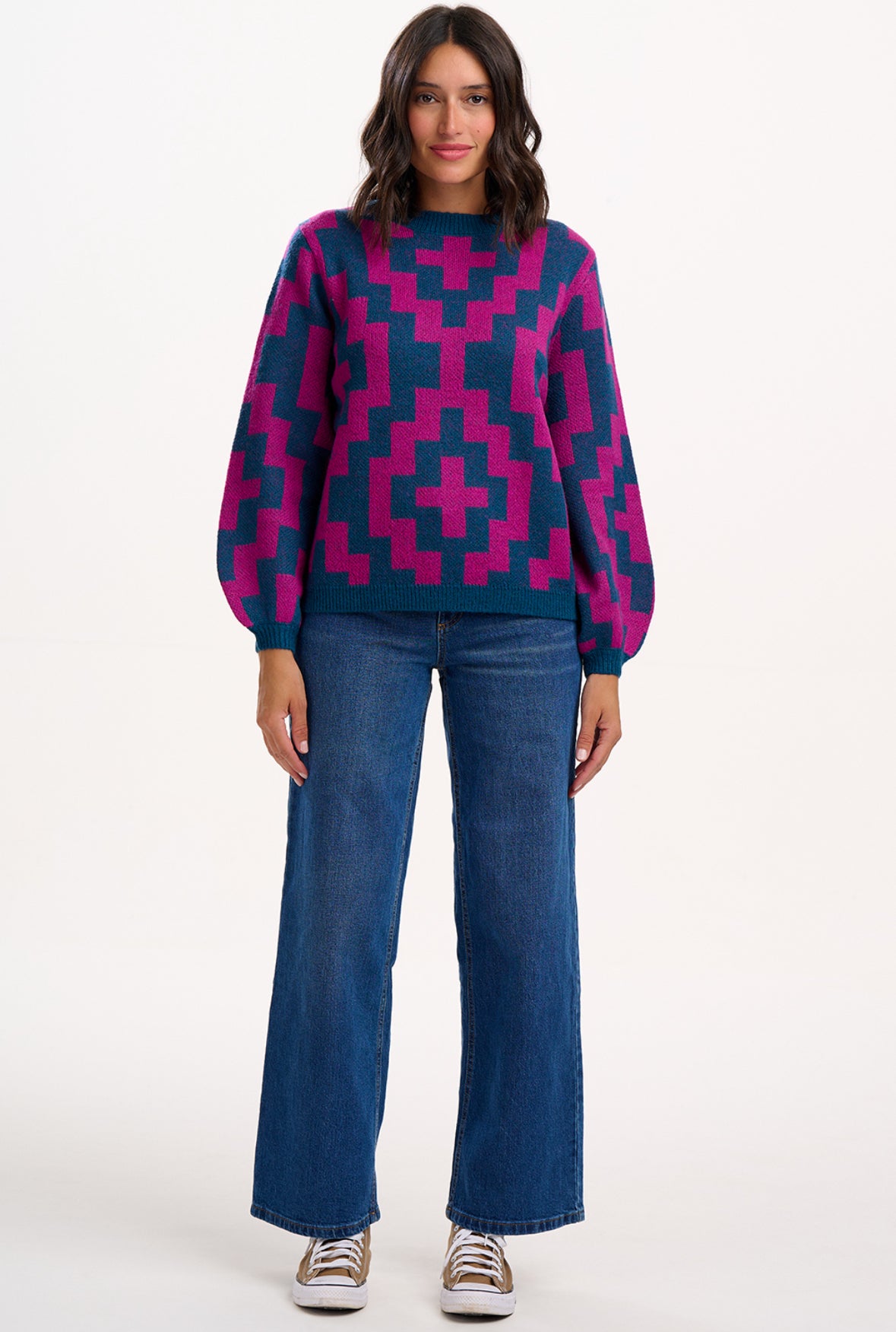 The Essie Jumper is a cosy, relaxed-fit knit designed for effortless everyday wear. Crafted from thicker textured yarn, it features a ribbed collar and cuffs, statement blouson sleeves, and a slightly shorter length for a modern silhouette. The standout detail? A bold folk diamond design in a contrasting pink and teal - adding a touch of fun to your knitwear collection.
