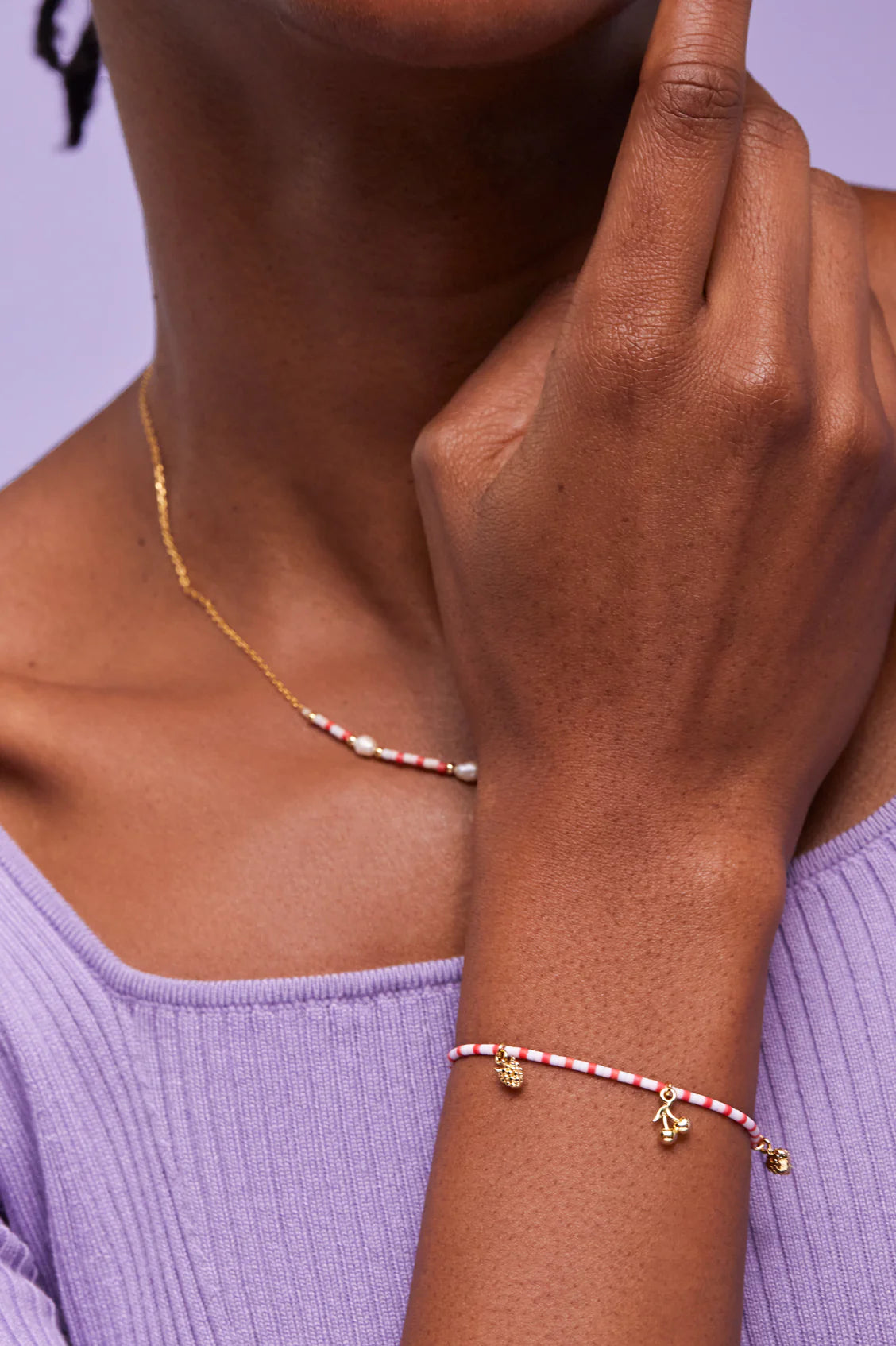 A playful bracelet that's sure to brighten up your day. Our gold-plated Fruity Miyuki Bracelet features a series of red and pink miyuki beads on a pink cord bracelet with fun fruit charms, including cherries and a strawberry... Berry cute! Pair it with our Pearl Miyuki Necklace for a colour-coordinated look.