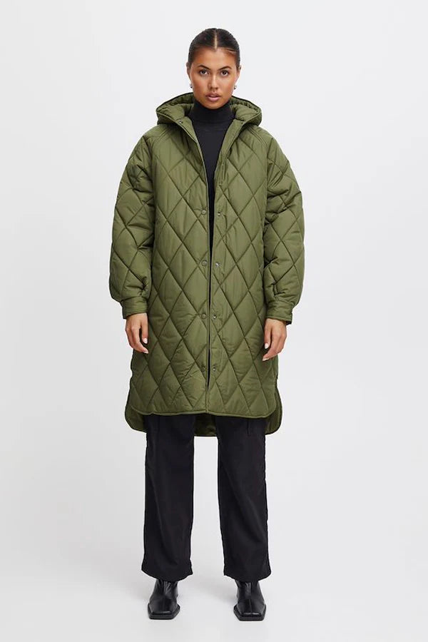 Stay warm and stylish in this cosy hooded quilted coat from Ichi. It features a concealed snap button fastening, full sleeves with cuffs, side pockets and a curved hemline with a subtle drop hem to the back. Available in a rifle green color, it's perfect for the chillier weather.