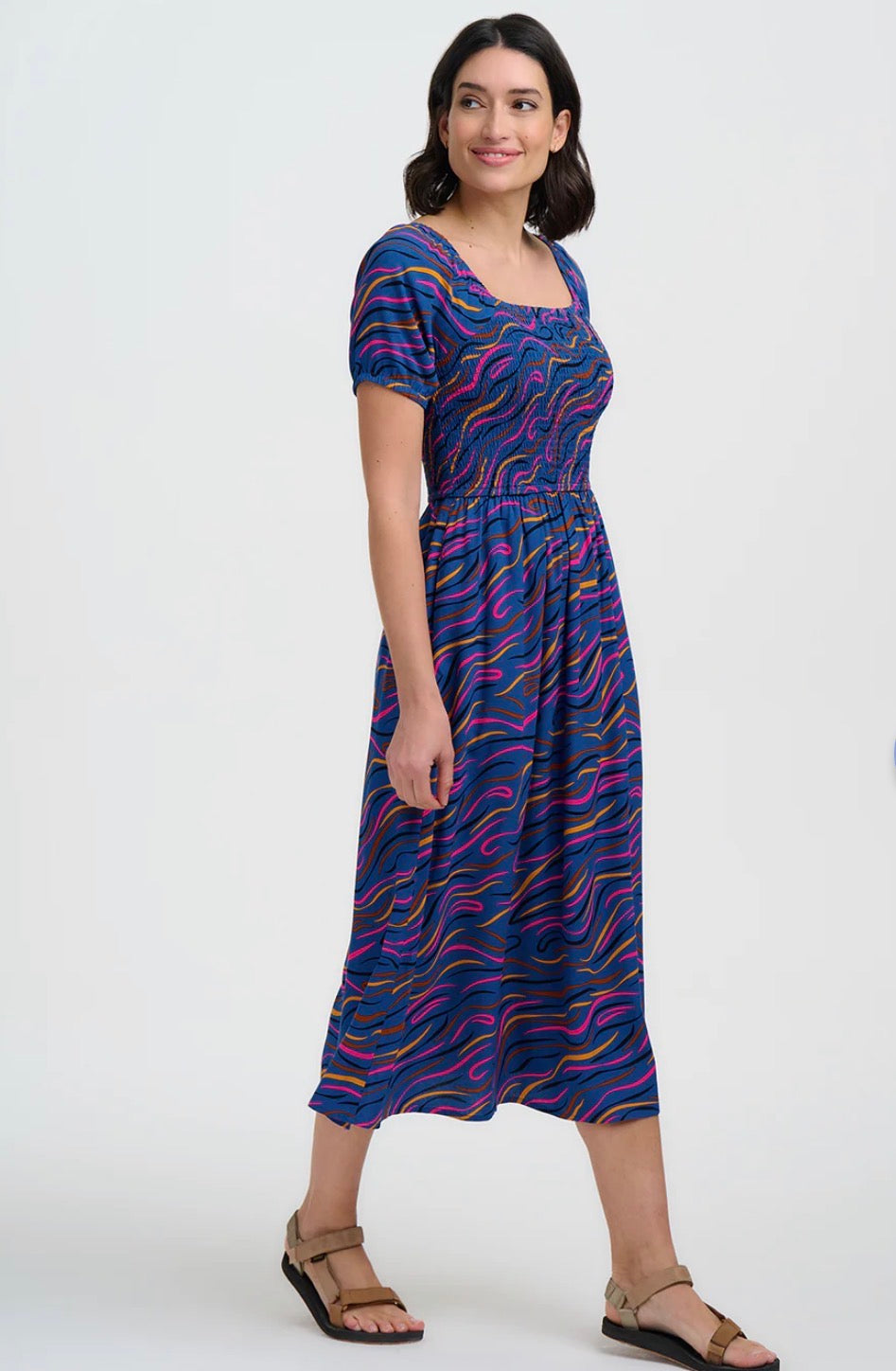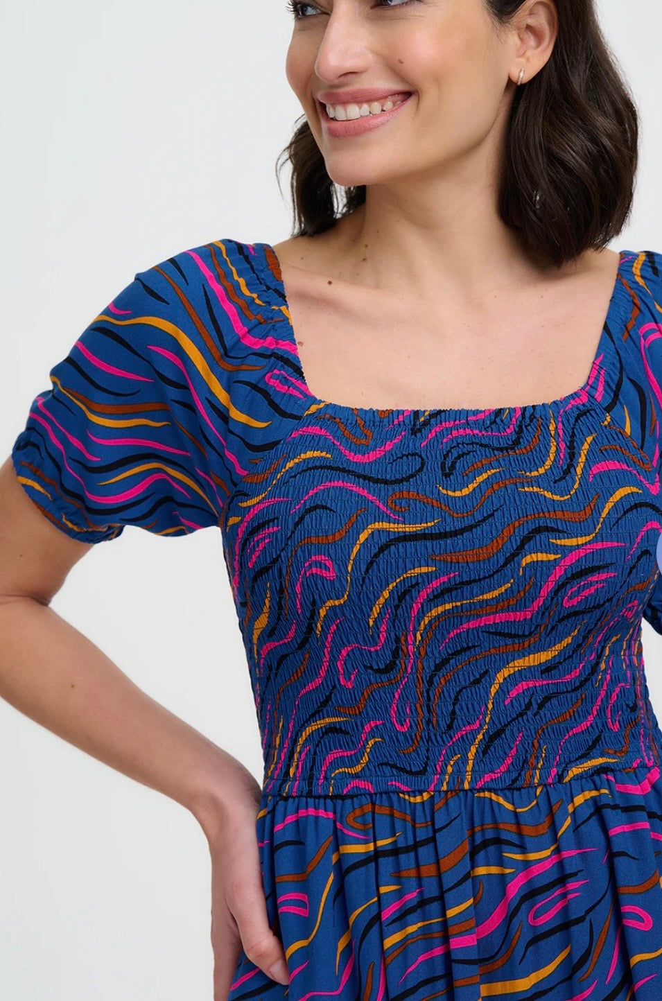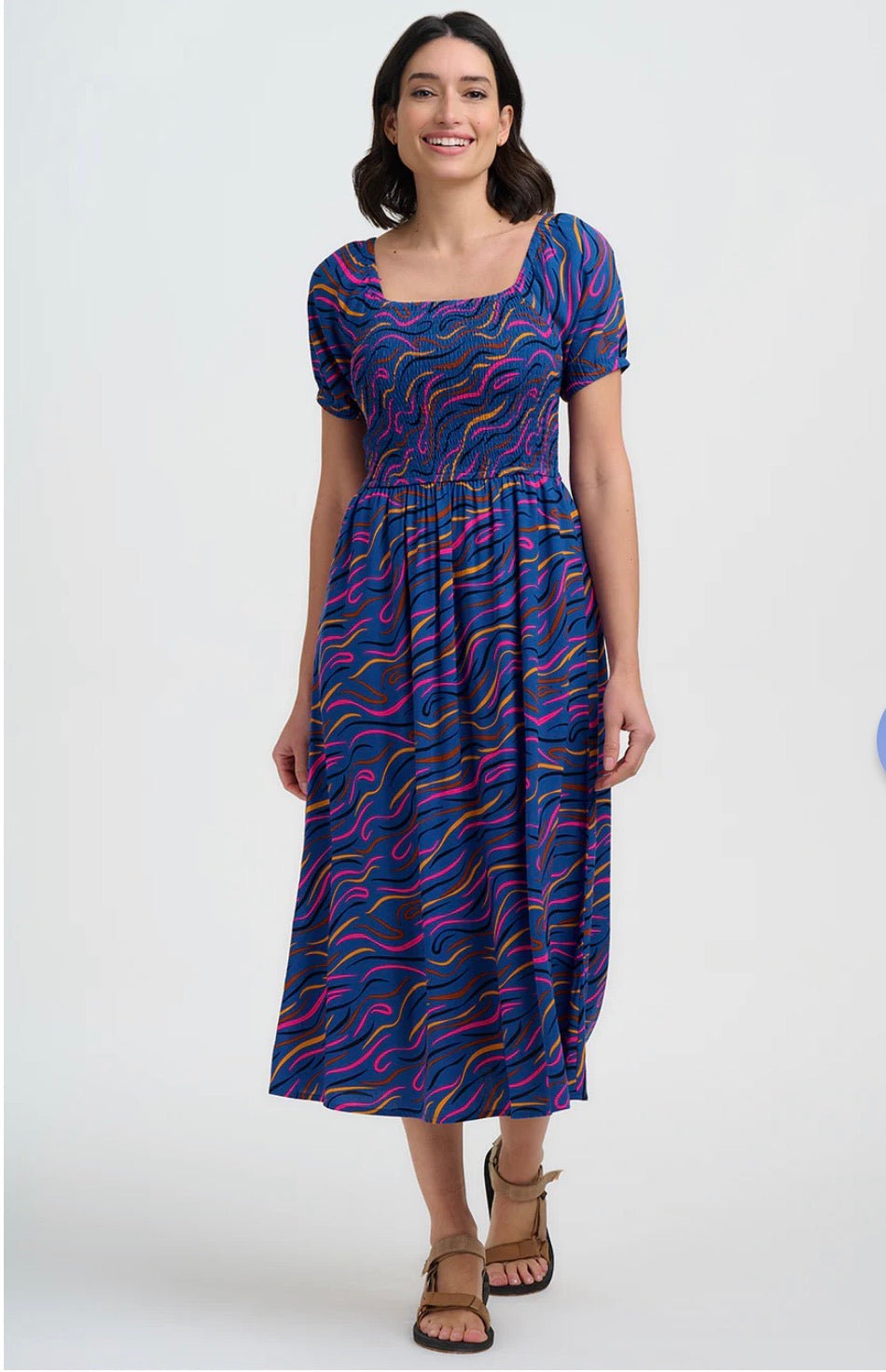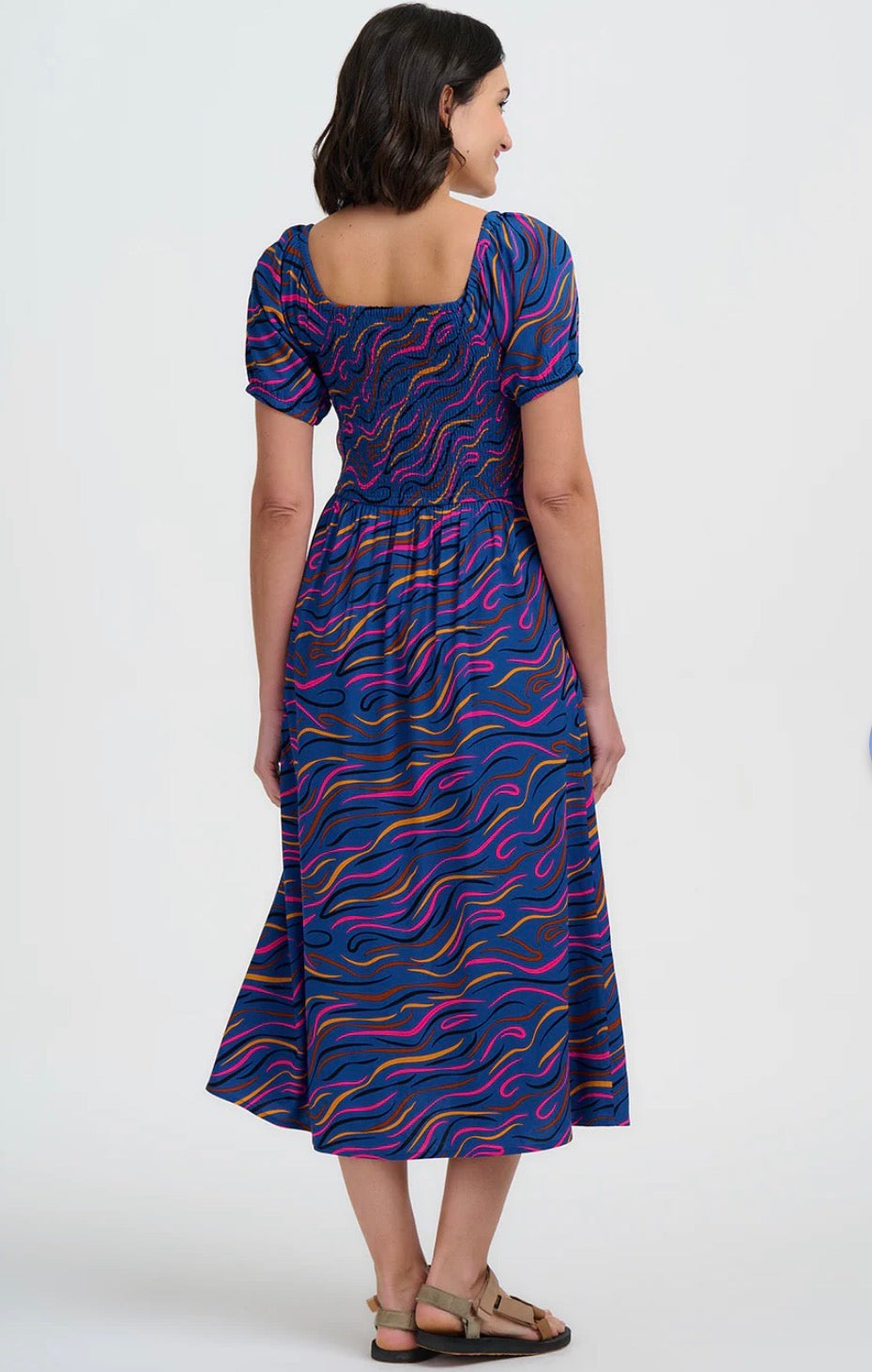 The Jolene Midi Dress is an effortlessly stylish choice for everyday wear. Designed with a square neckline, short puff sleeves, and a shirred elasticated bust for a flattering and comfortable fit. The dress features a high waist and a full midi skirt with practical side pockets. Showcasing the vibrant tiger-stripe waves in orange, pink, and black that flow across a deep blue background for a bold, dynamic pattern. – perfect for adding a pop of colour to your day.