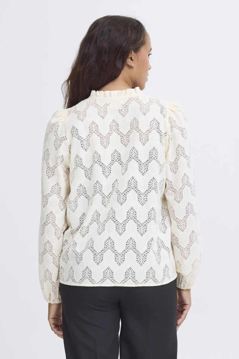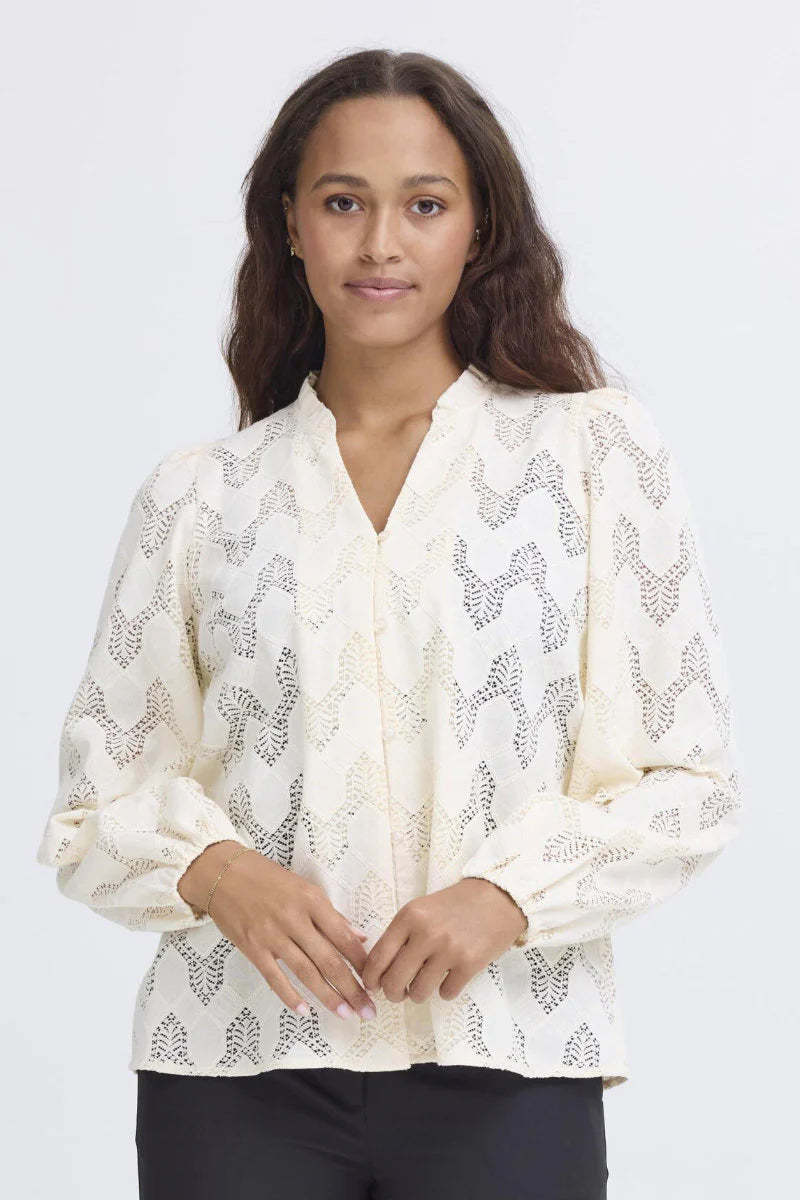 A stunning, vintage inspired lace shirt, this Ichi Junela shirt is perfect for this season. Full puffed sleeves with soft padding at the shoulder and elasticated cuffs. A stand up piecrust collarwhich opens to a v neck. Small pearlised buttons centre front, finish the piece off perfectly.