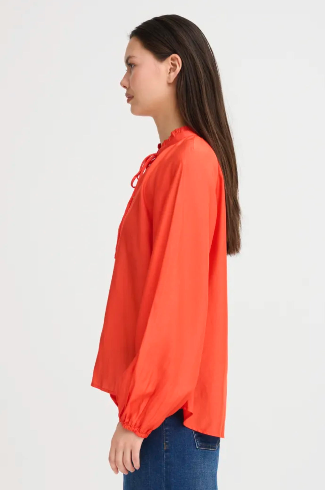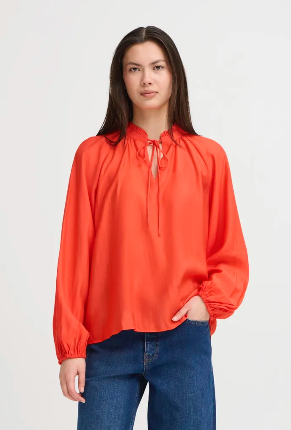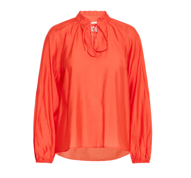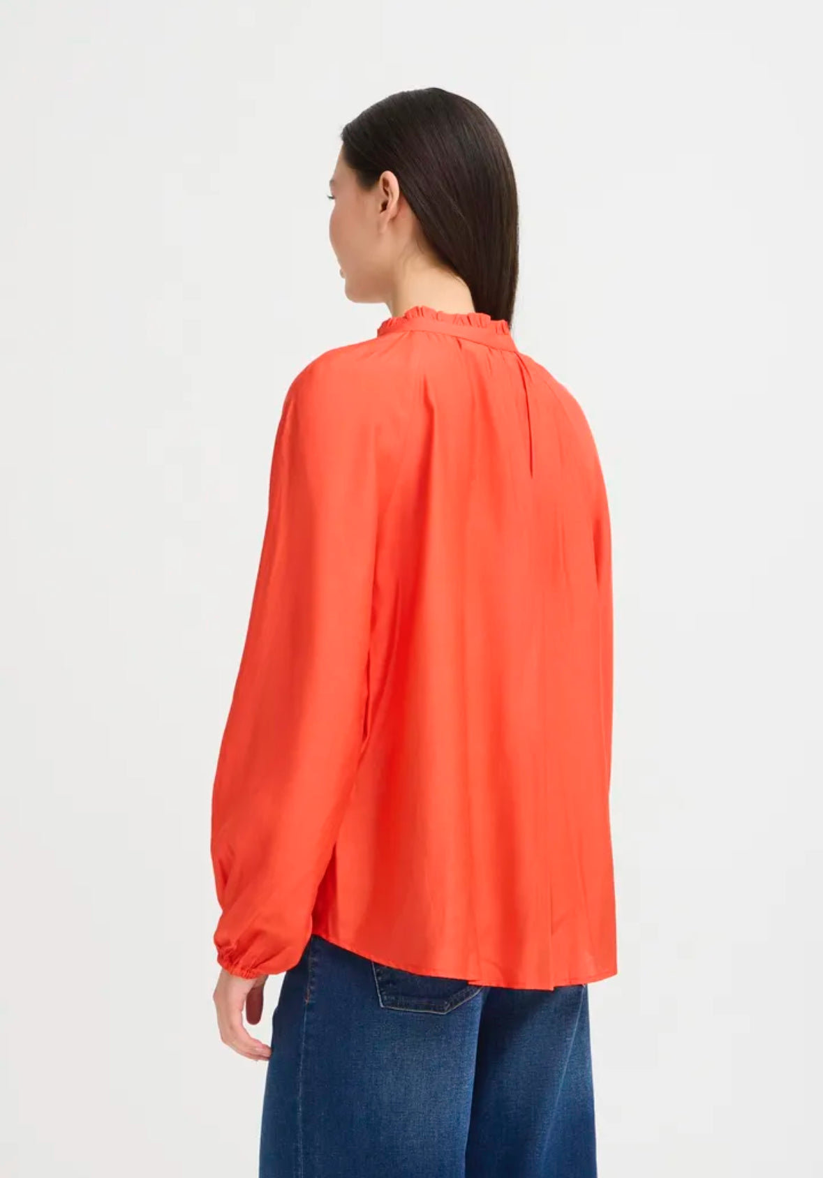 The Ichi Karlani Shirt features an elegant ruffle embellishment adorning the stand collar and extending down the front placket, complemented by a soft pleated sleeve and distinctive wide cuffs. The striking red colour makes this a statement piece.