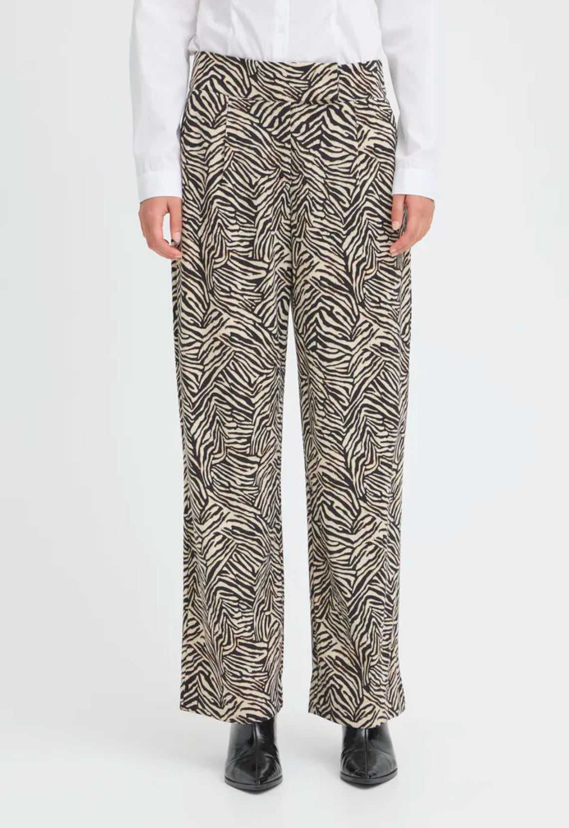 Take a walk on the wild side with our Ichi Kate Zebra pants. A super soft trouser that features a wide leg finish, with a darted front, side pockets and a hook and eye fasten; all finished off with a striking zebra print.