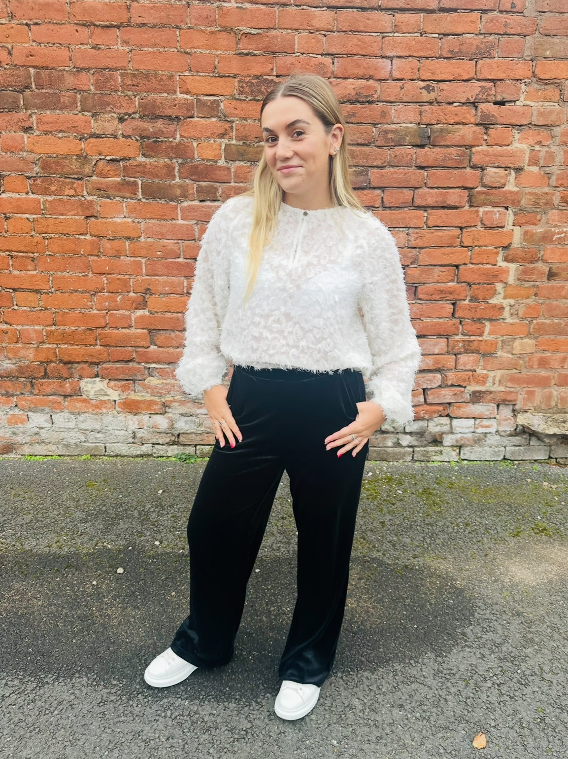 A wardrobe classic, these luxurious Lavanny Pants from Ichi offer a refined take on a timeless style. Crafted from velour in a classic black shade, the sumptuous design features a flattering flat-front construction, an elasticated waistband and a wide leg for a sophisticated, contemporary fit.