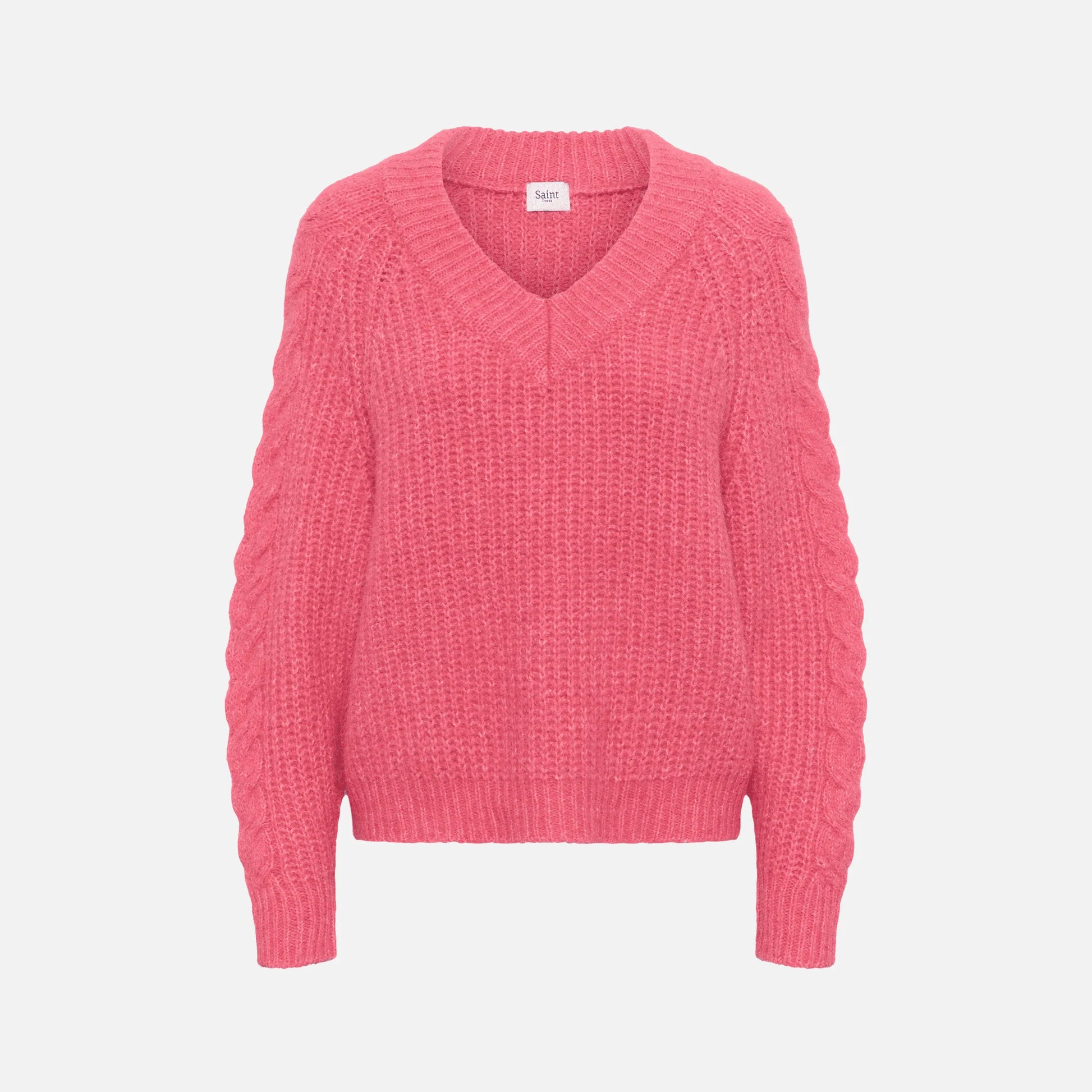 The Manda pullover by Saint Tropez is vibrant knit that brings both comfort and style to your wardrobe. Designed in a striking Wild Rose Melange pink, it features delicate cable detailing along the sleeves, a flattering V-neckline, and ribbed trims for a polished finish. The loose fit and soft, textured knit make it perfect for everyday wear.