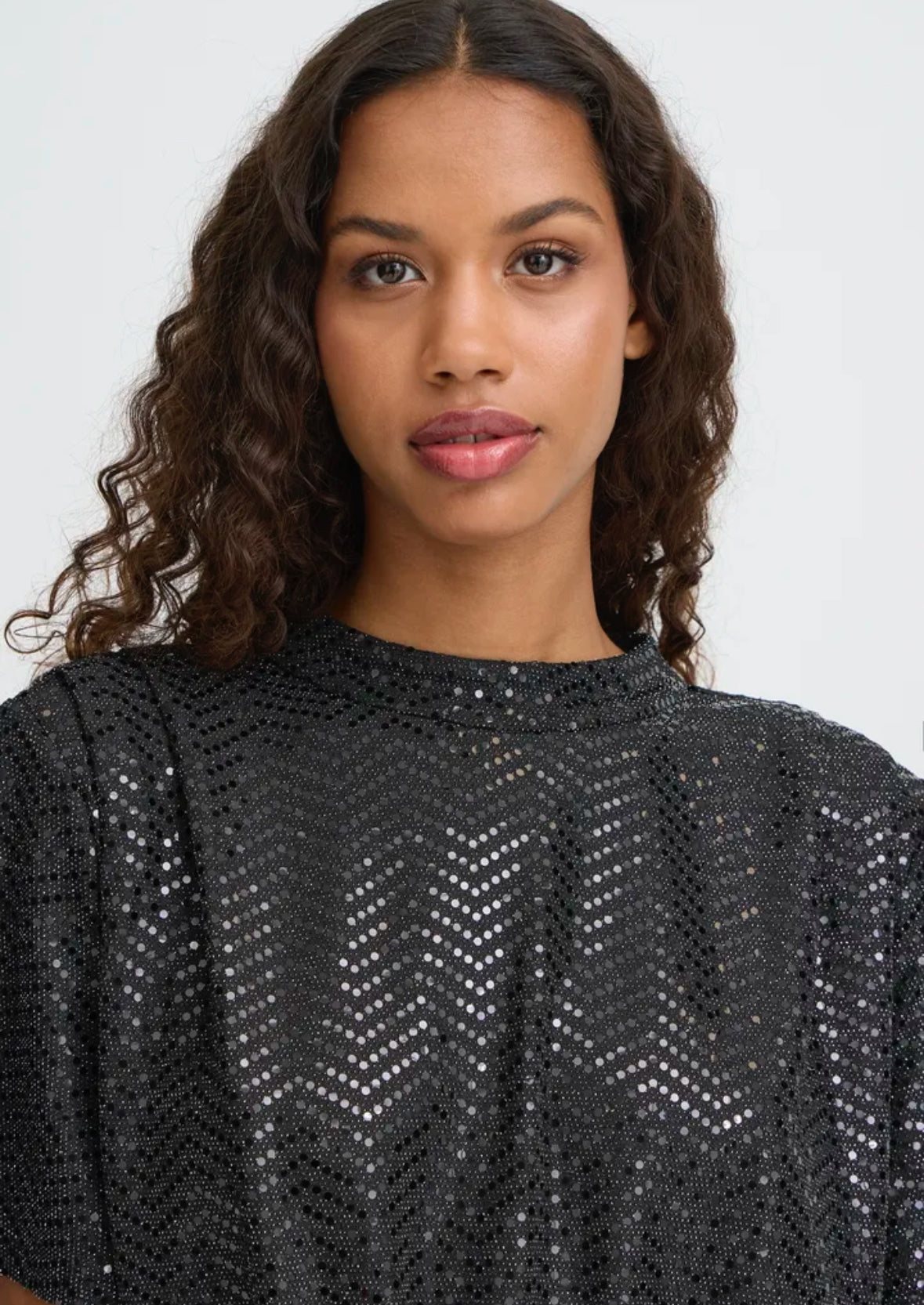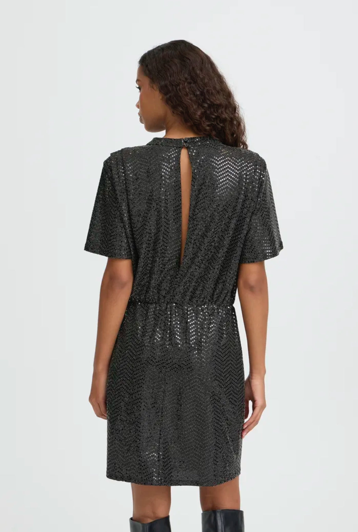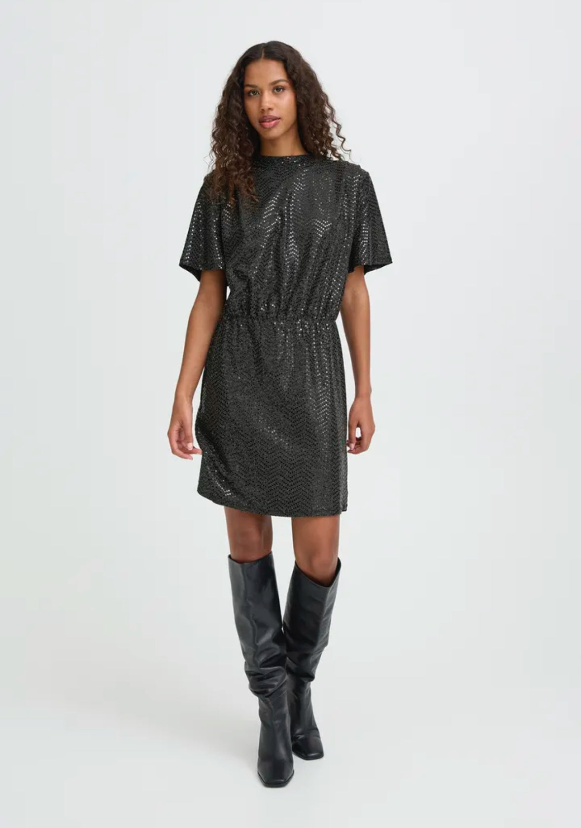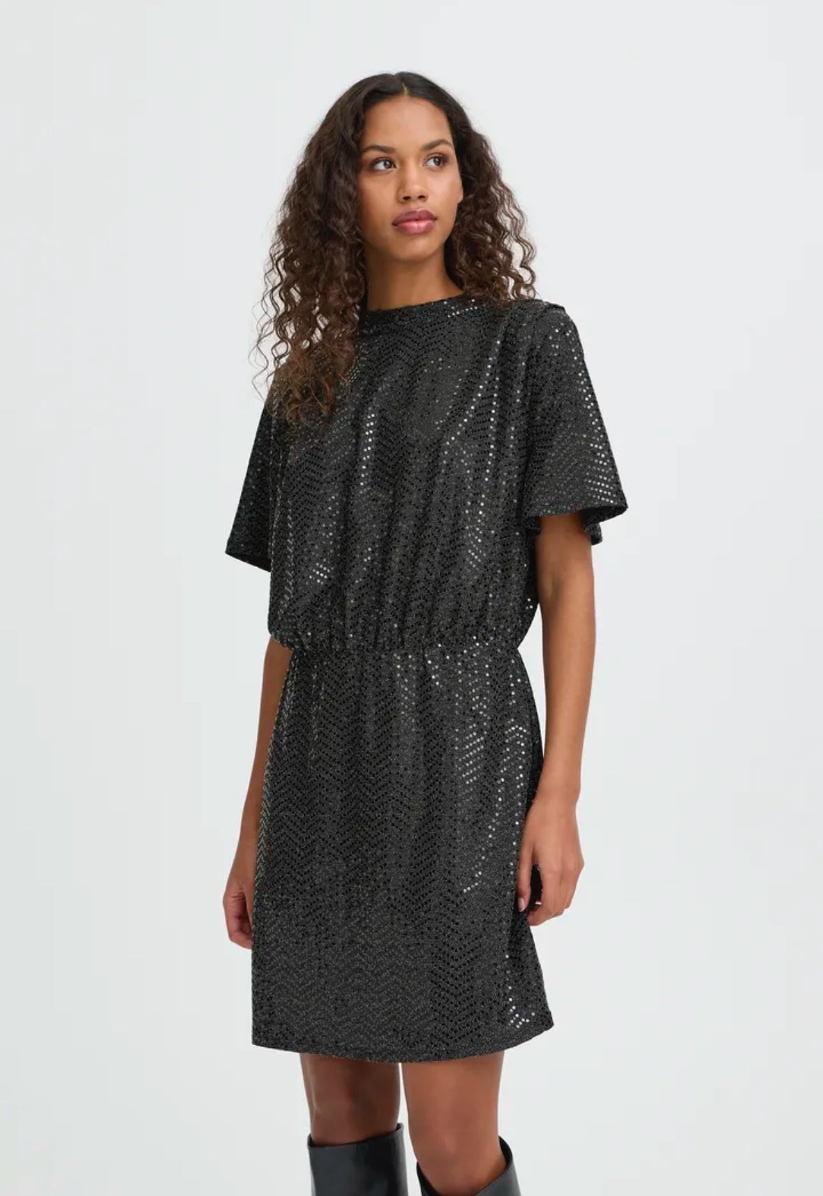 Turn heads this party season with our Ichi Nelenia dress. This statement piece features a sleek high neckline, and short sleeves for a touch of elegance, with the skater skirt adds a touch of playful movement. Fully adorned in shimmering black sequins, that catches the light from every angle.