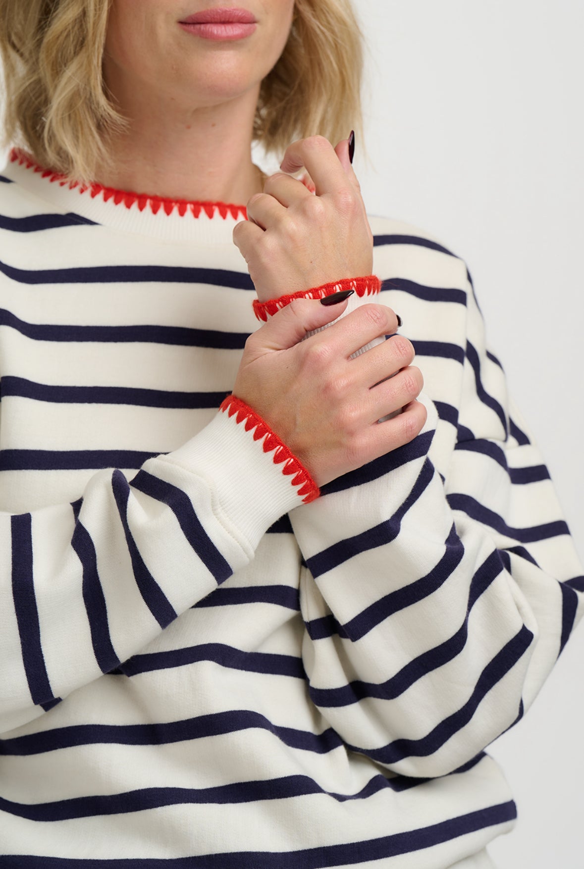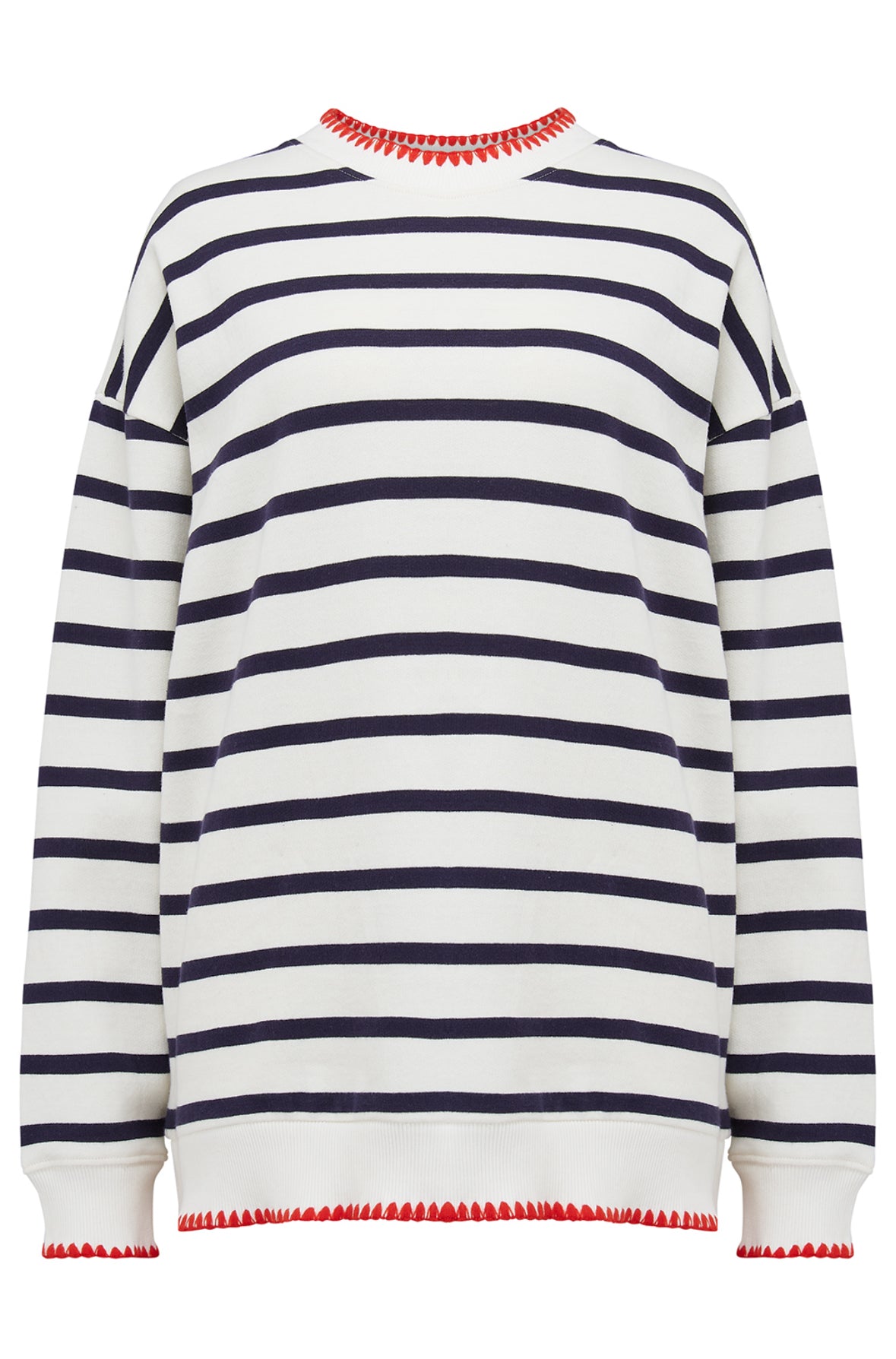 The Sugarhill Brighton Noah Sweatshirt is a wardrobe staple that offers effortless style and cosy comfort in one. This crew neck sweatshirt is crafted in a semi-relaxed fit with a super-soft brushed interior, perfect for everyday wear. Designed with a navy stripe on a contrasting off-white base and an embroidered detailing on the collar, cuffs and hem. Our Noah sweater brings a fun twist to your loungewear or casual wardrobe.