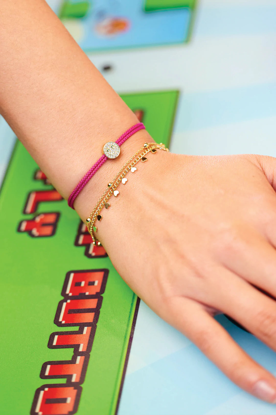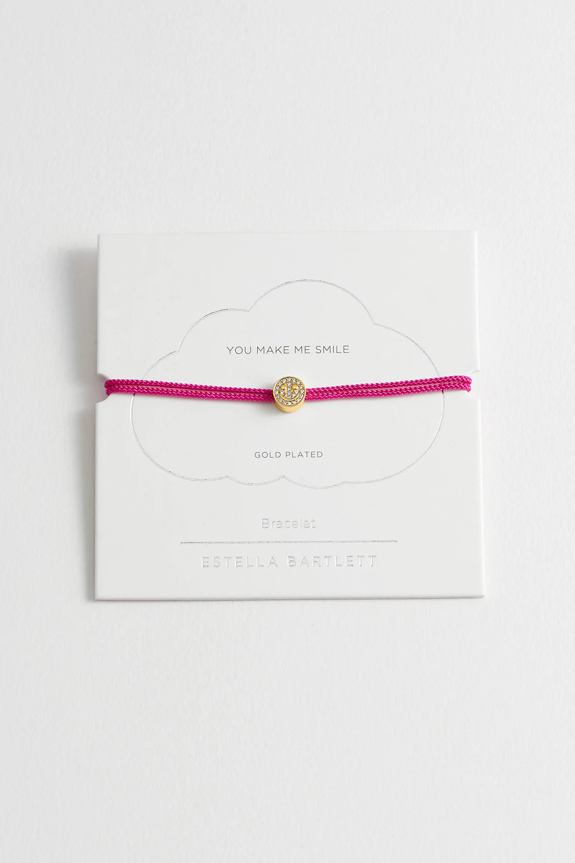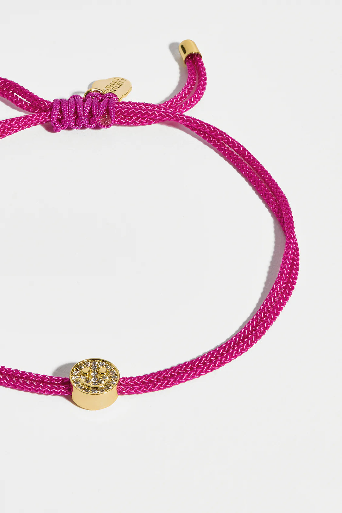 Add a vibrant burst of colour with our Pave Smile Cord Bracelet. A gold plated, sparkling pave smiley face sits on a double fuchsia cord, making it the perfect piece to add a splash of colour to your bracelet stack. It is also the ideal gift to give to the person who makes you smile