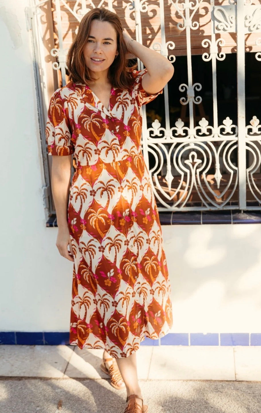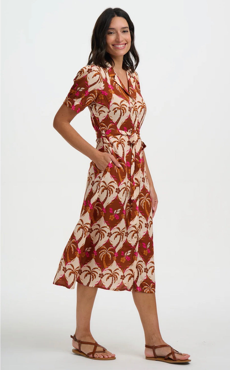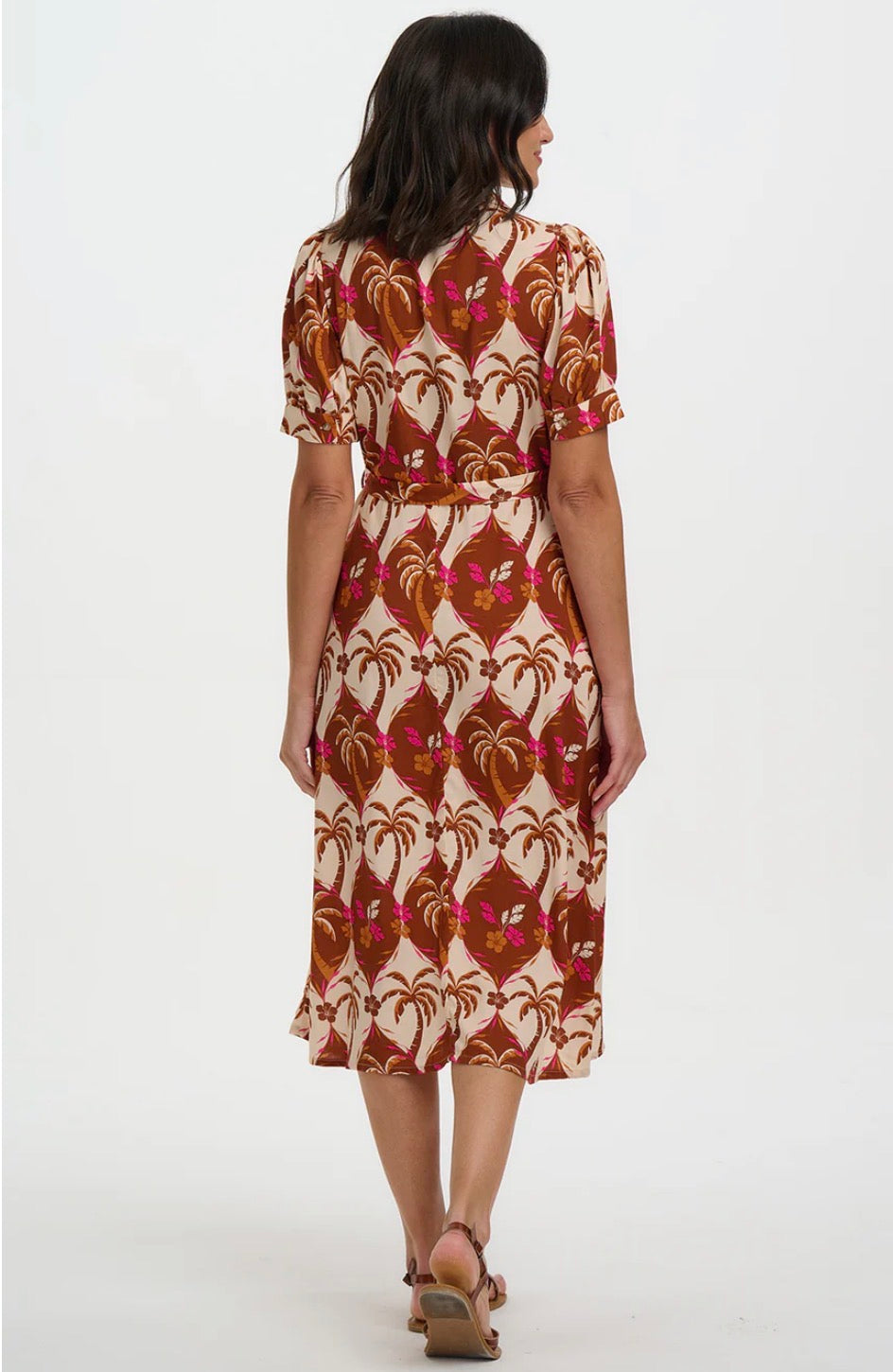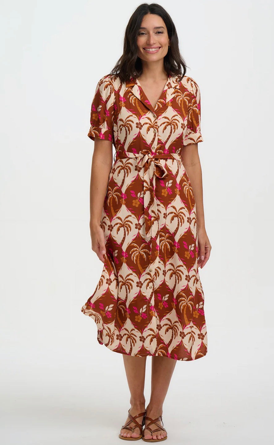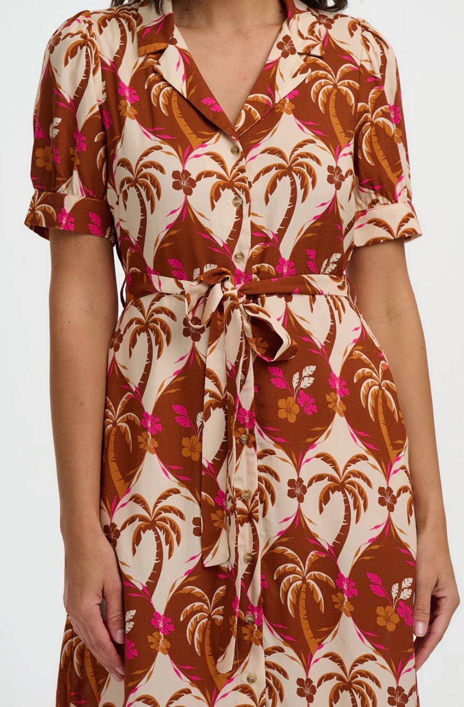 Say hello to Penelope — a cheerful take on a timeless silhouette. This feminine midi dress features a flattering fit-and-flare shape, complete with a button-down front, soft puff sleeves, and a lapel collar for a polished touch. The self-fabric waist tie allows you to cinch it just right. Crafted in our joyful tropical palm trees and florals repeat in warm browns and bright pinks, forming a bold vintage-inspired pattern.