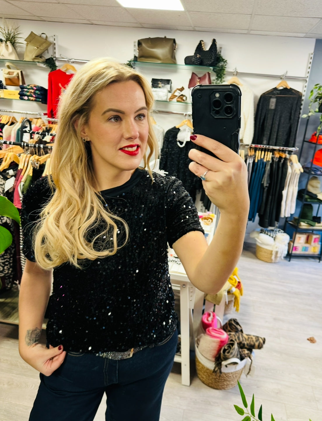 Elevate your festive wardrobe with our Sequin Tee in red. A short sleeve t-shirt that features a round neckline and an all over sequin finish. This sequin top is guaranteed to get you in the festive mood.