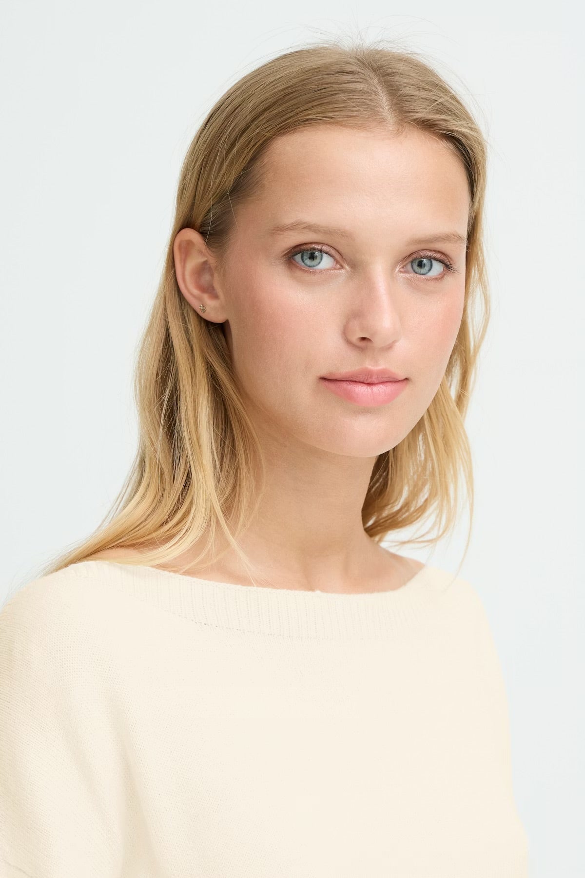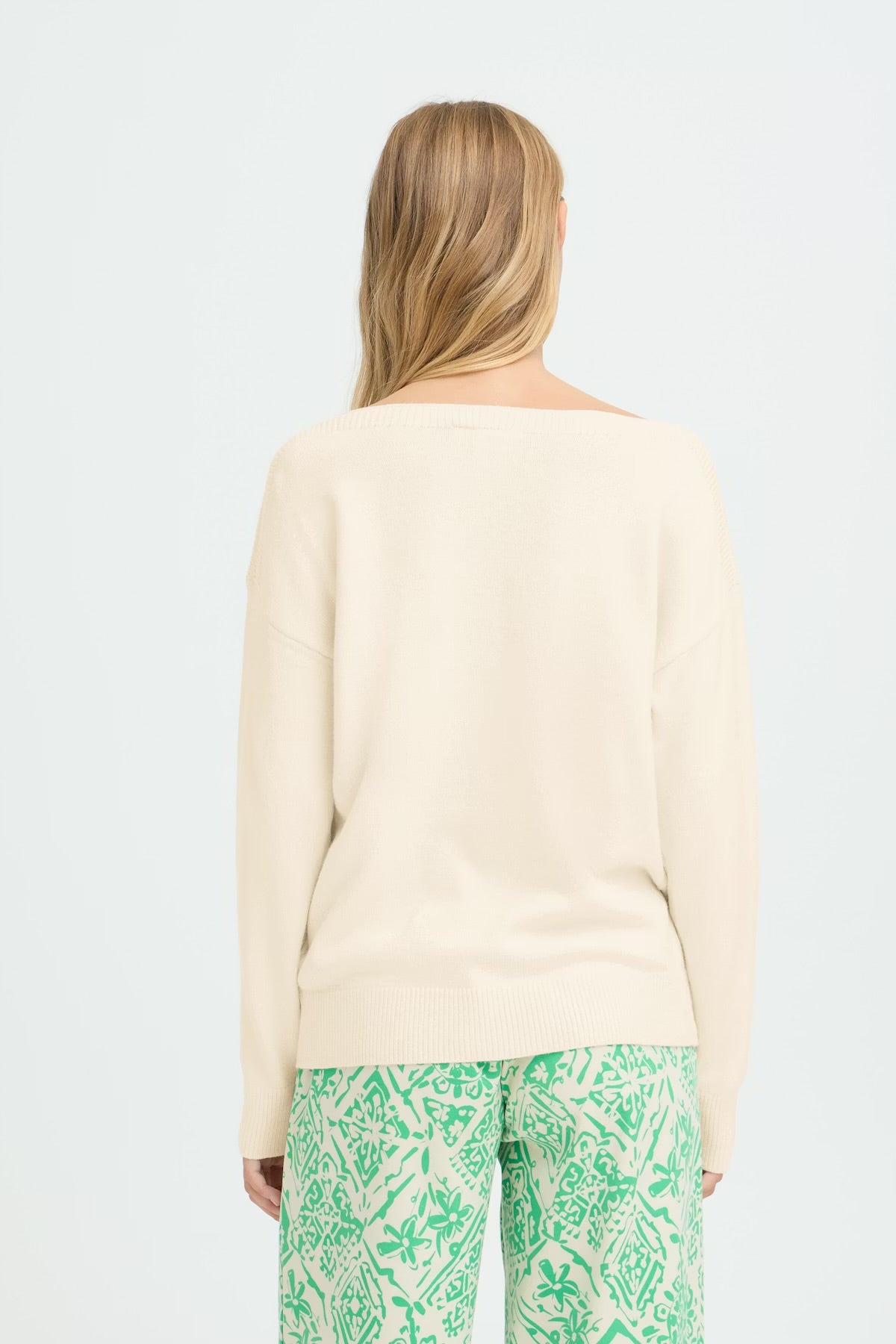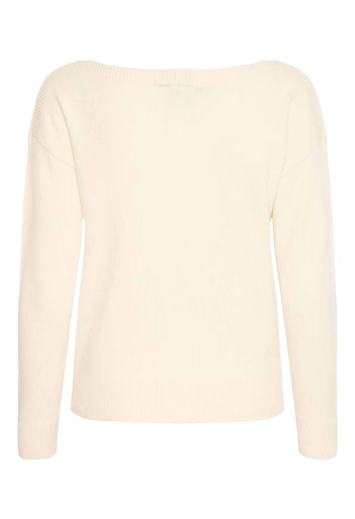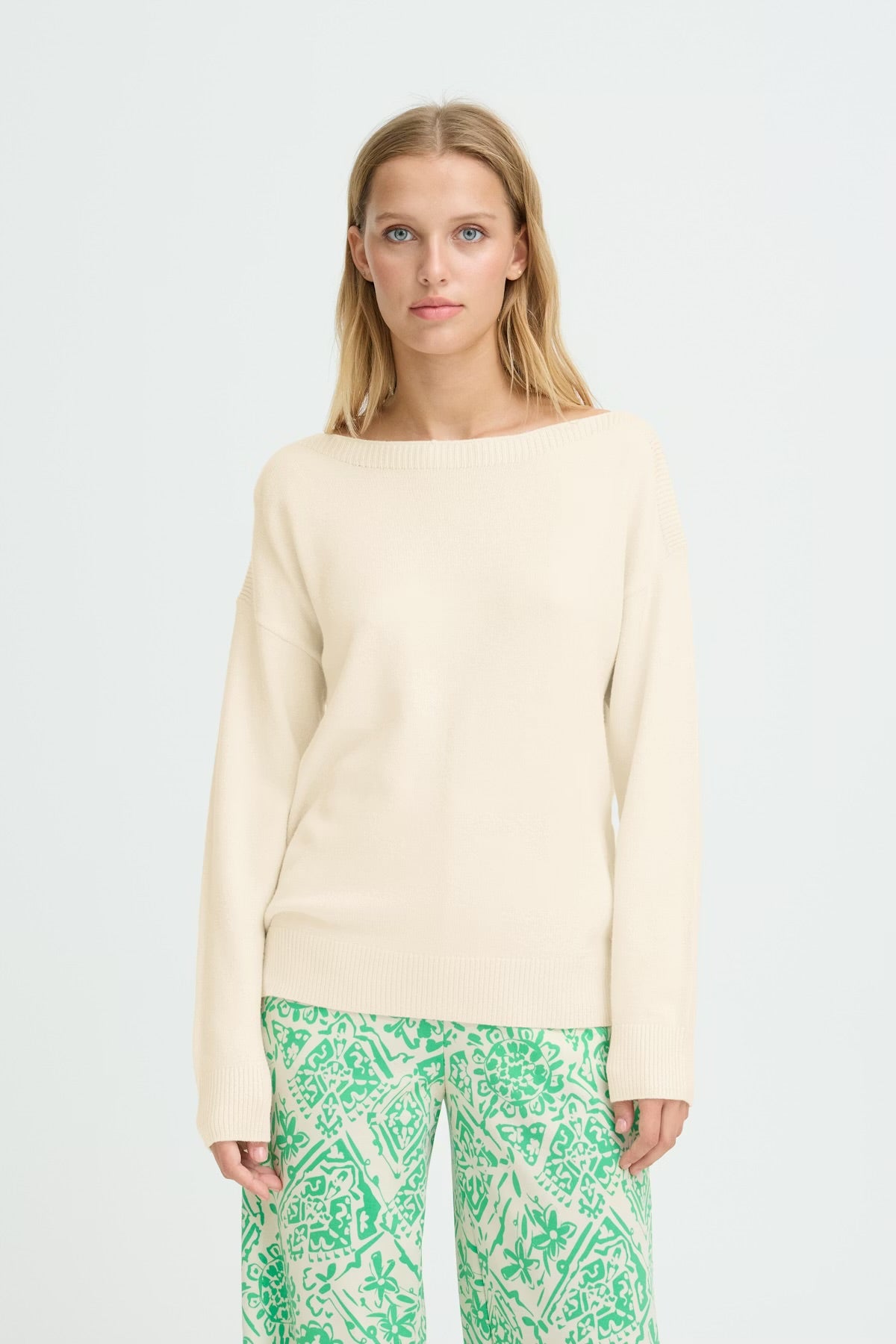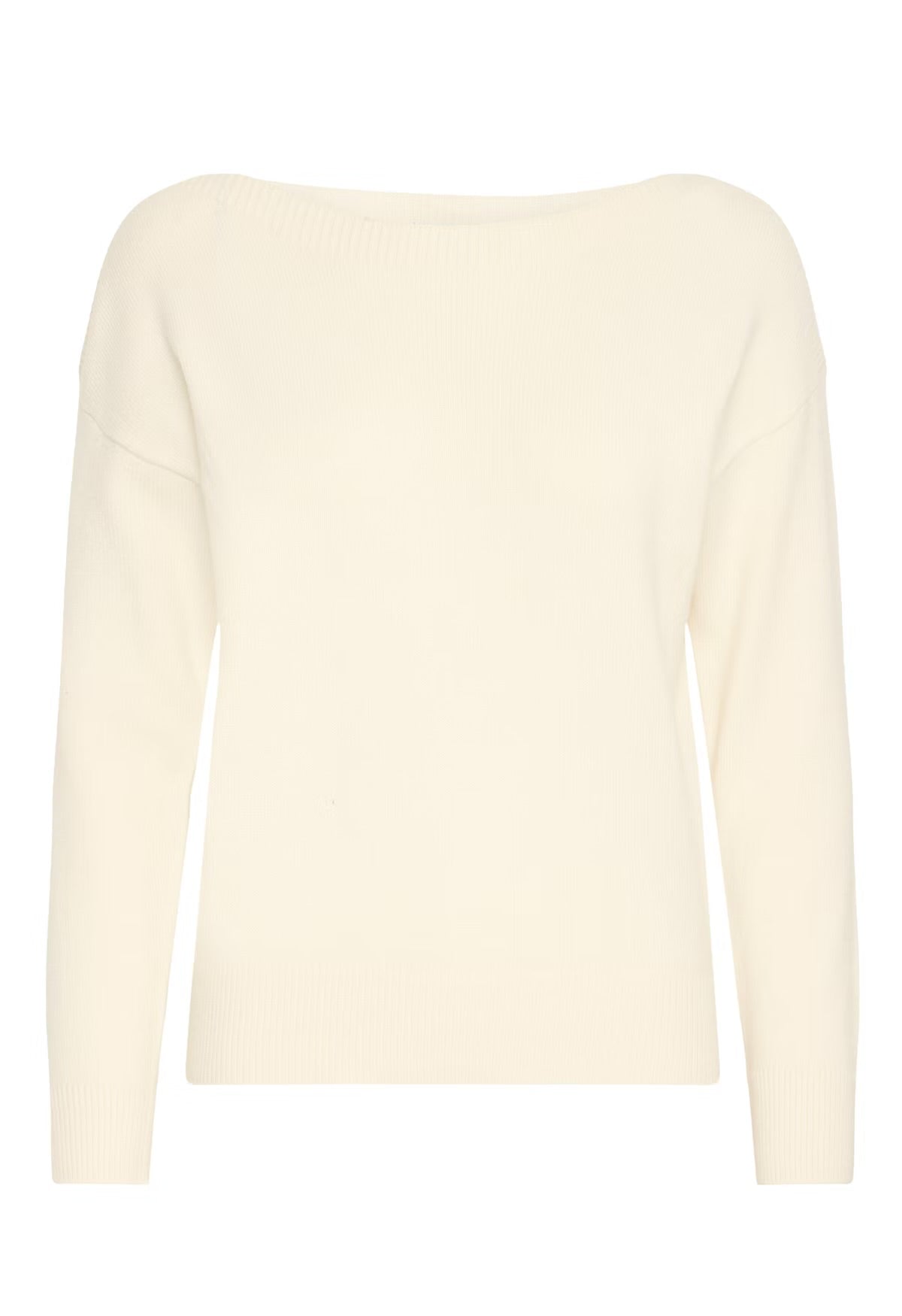 A true Spring classic - the Ichi Sella is an off white knitted jumper. This pullover features a roomy straight fit and soft finish, accented by a wide boat neckline, dropped shoulders, and ribbed hems. Subtle, laid-back style that pairs effortlessly with any look.