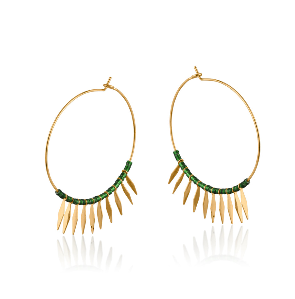 These gold plated hoop earrings feature colourful beading made with hand-cut glass stones. Wear solo or team with simple gold hoops. At least 50% of the brass used in the jewellery we make is recycled from leftover/overhead brass. All posts are hypoallergenic made from surgical steel.