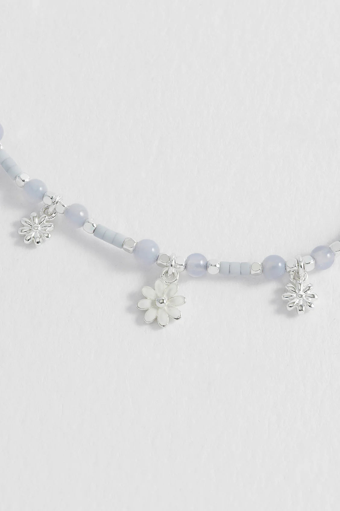 Embrace serenity with our Blue Lace Agate & Enamelled Wildflower Bracelet. Smooth Blue Lace Agate stones are paired with delicate enamelled wildflowers, creating a calming yet vibrant design. With an adjustable slider for the perfect fit, this bracelet is a timeless addition to your collection.
