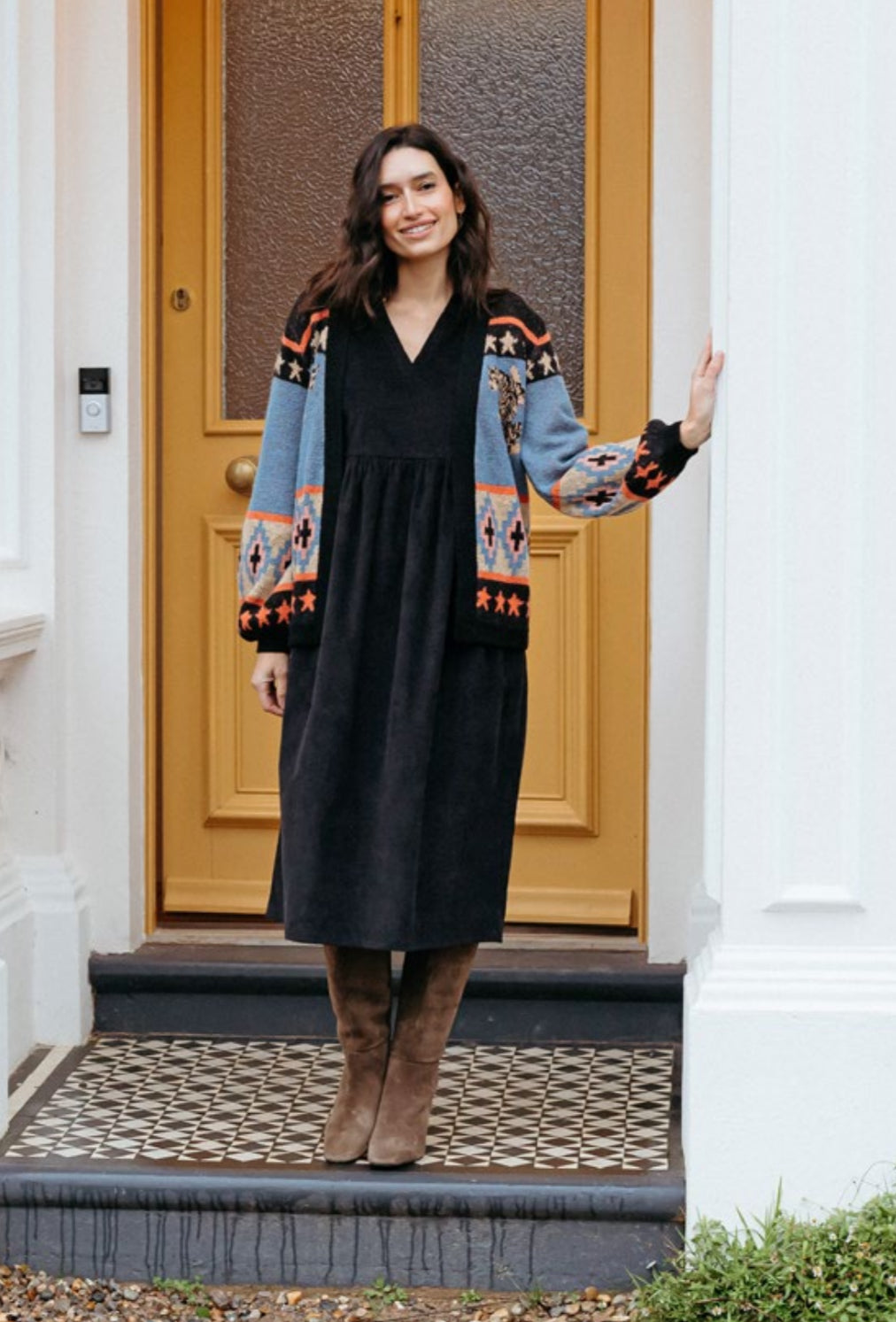 Get cosy with our favourite cardigan. Our Yvette Cardigan with a flattering relaxed shape and blouson sleeves. As there are no fastenings at the front, it's easy to layer as a jacket too. Featuring muted blue and black knit with orange and beige patterned panels, and two climbing tigers on the front and back of the cardigan